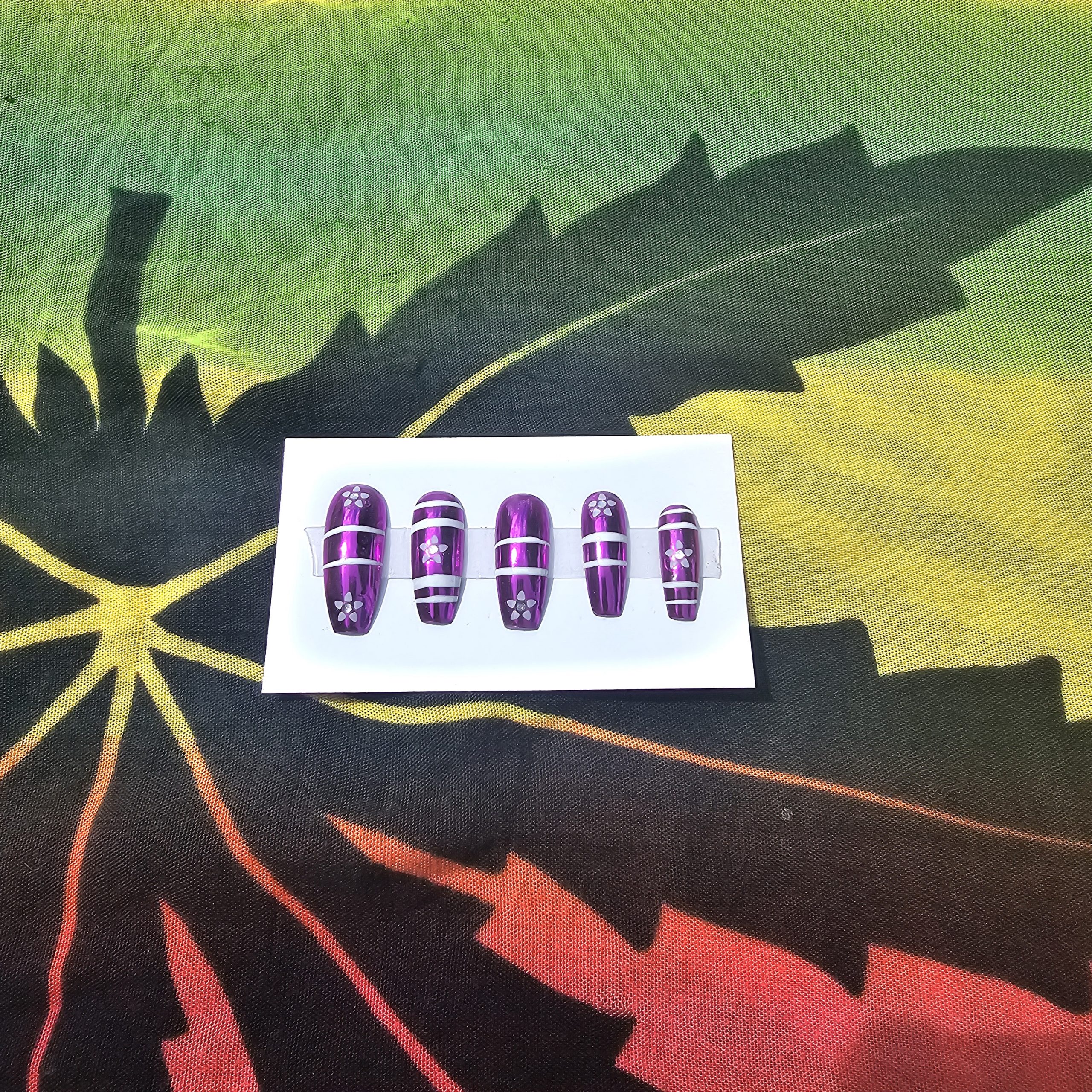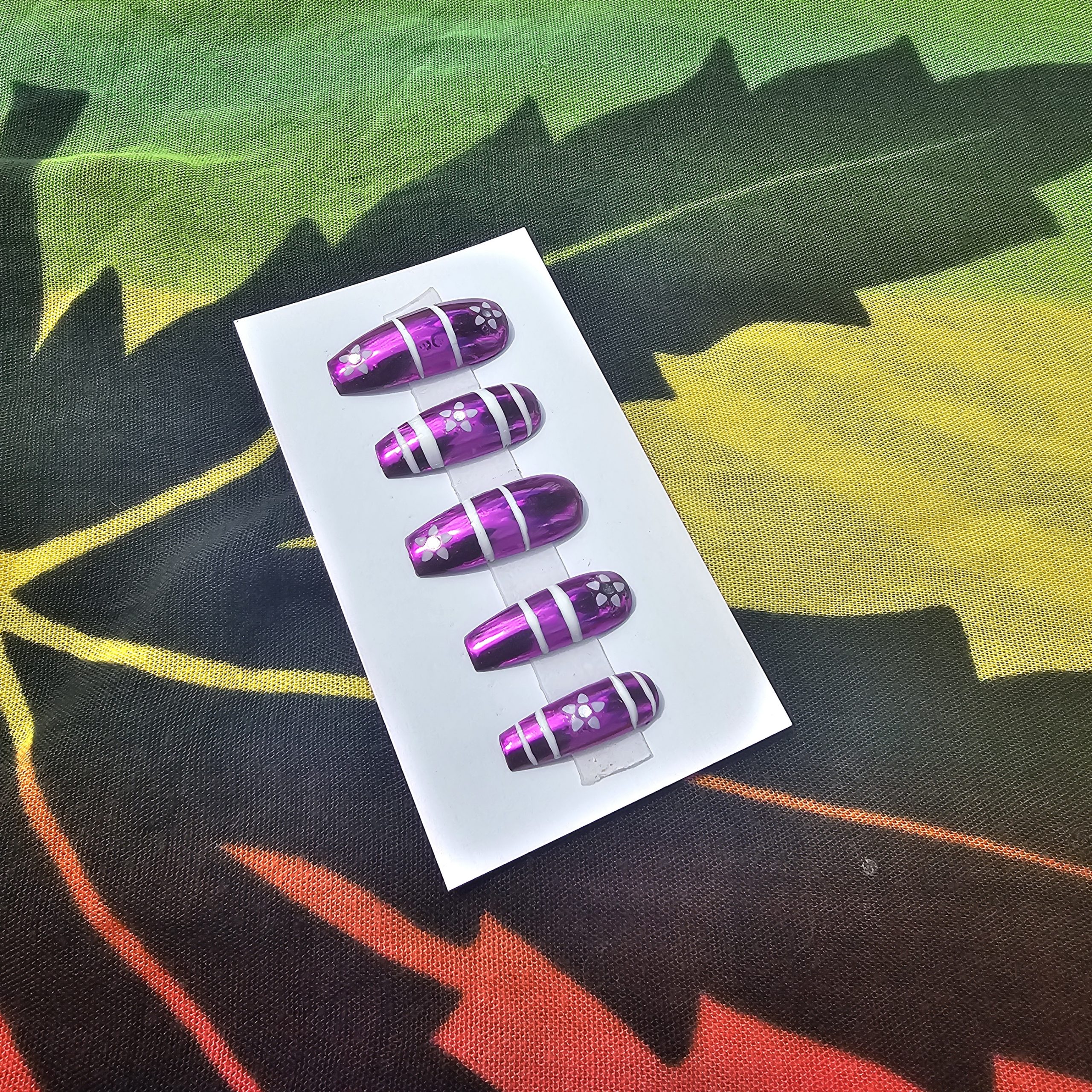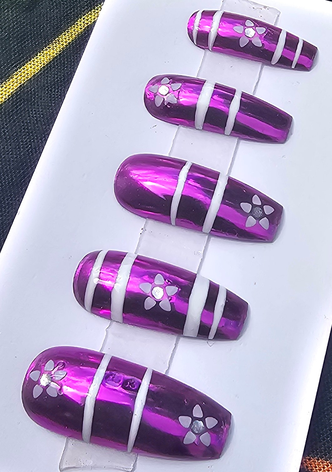 Elevate your nail game with this bold, high-shine chrome set in a stunning metallic purple 💜✨ Designed to turn heads, this look features sleek precision striping paired with delicate floral accents for the perfect balance of edgy and feminine 🌸