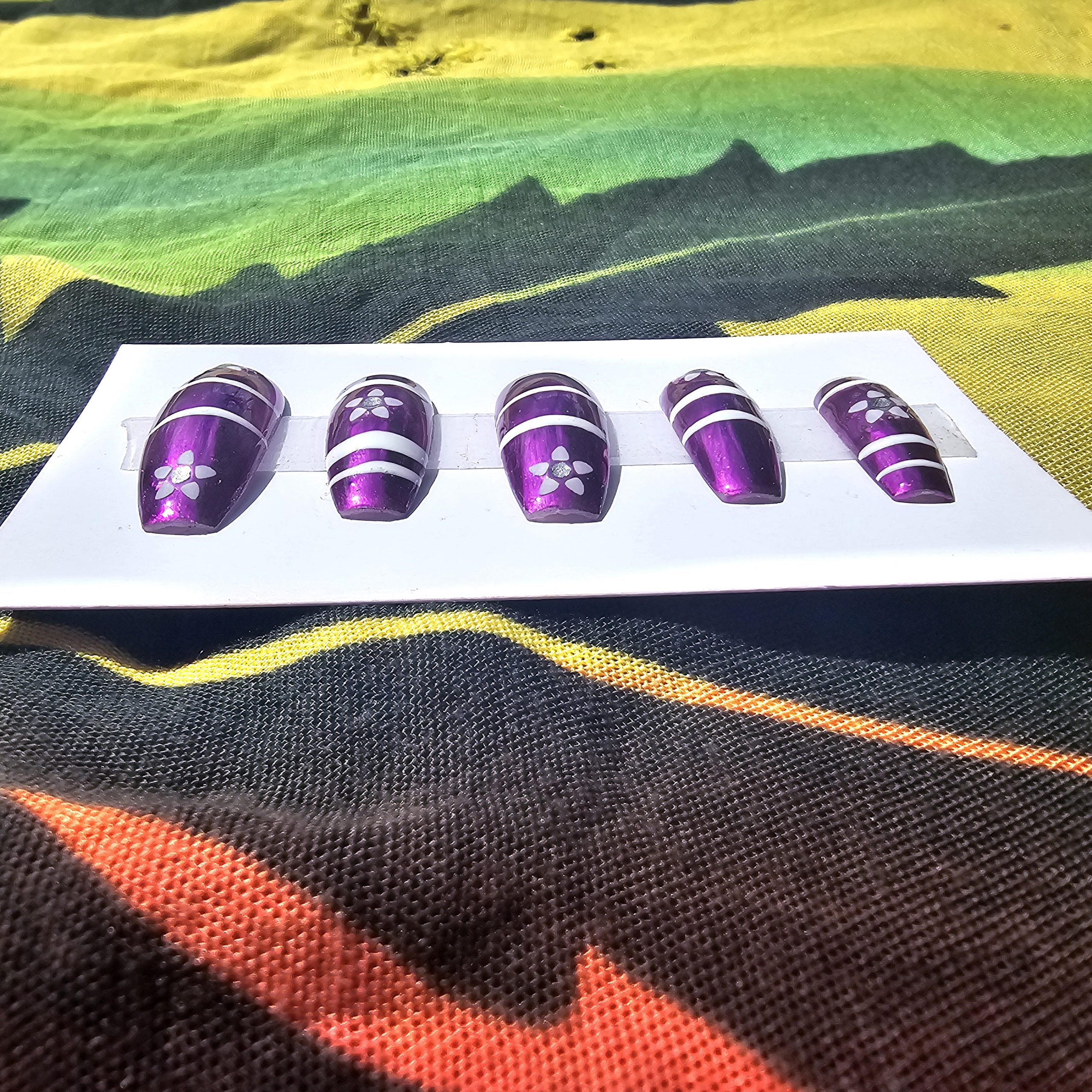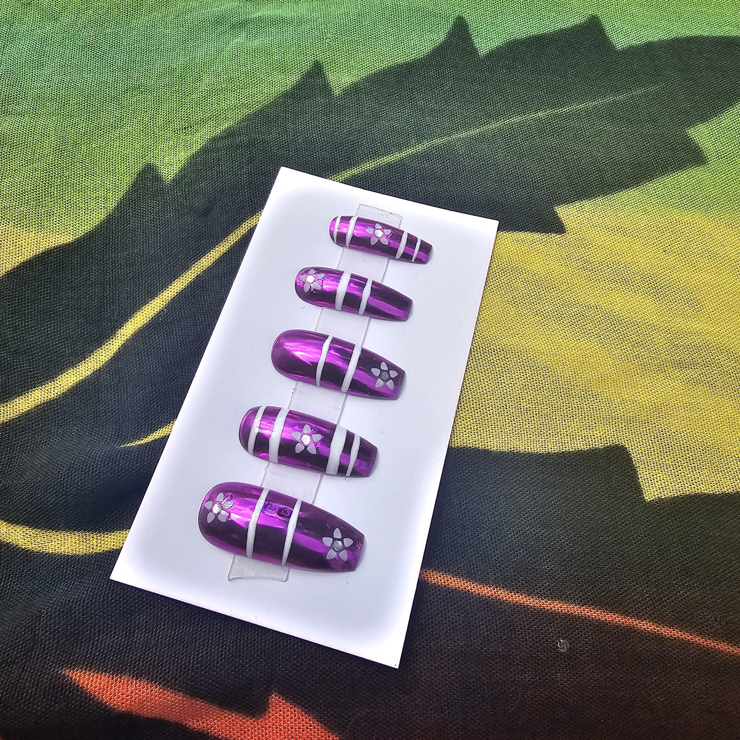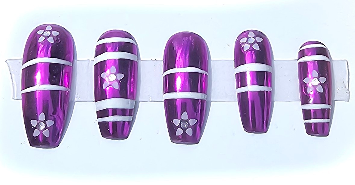 Elevate your nail game with this bold, high-shine chrome set in a stunning metallic purple 💜✨ Designed to turn heads, this look features sleek precision striping paired with delicate floral accents for the perfect balance of edgy and feminine 🌸