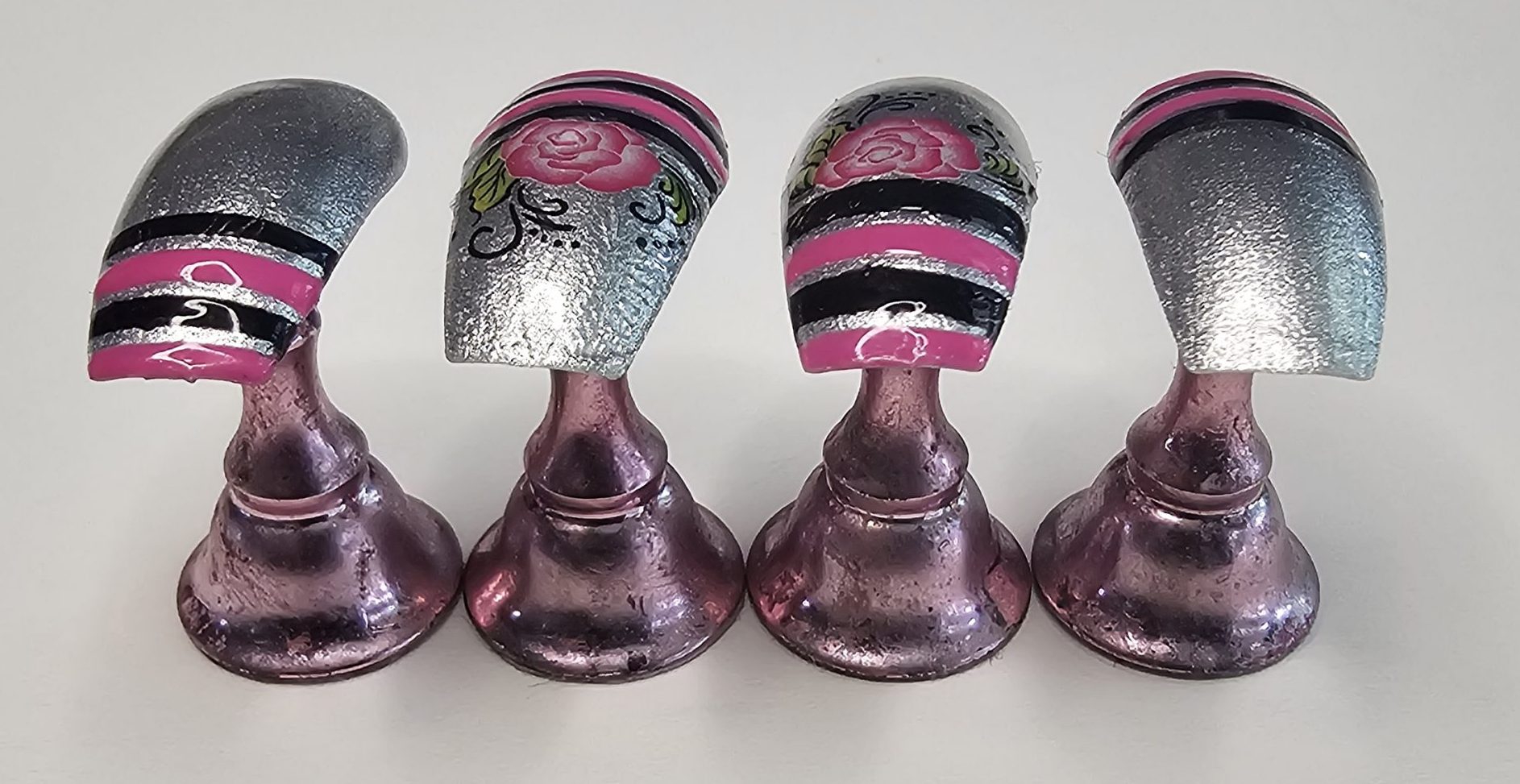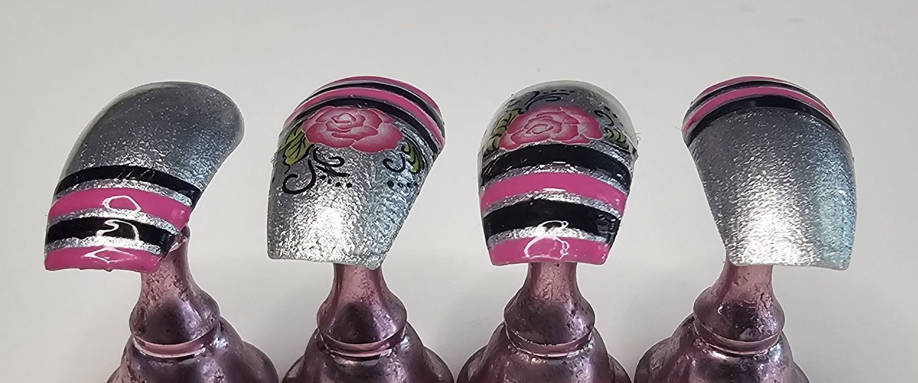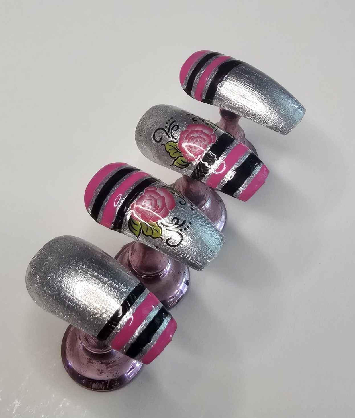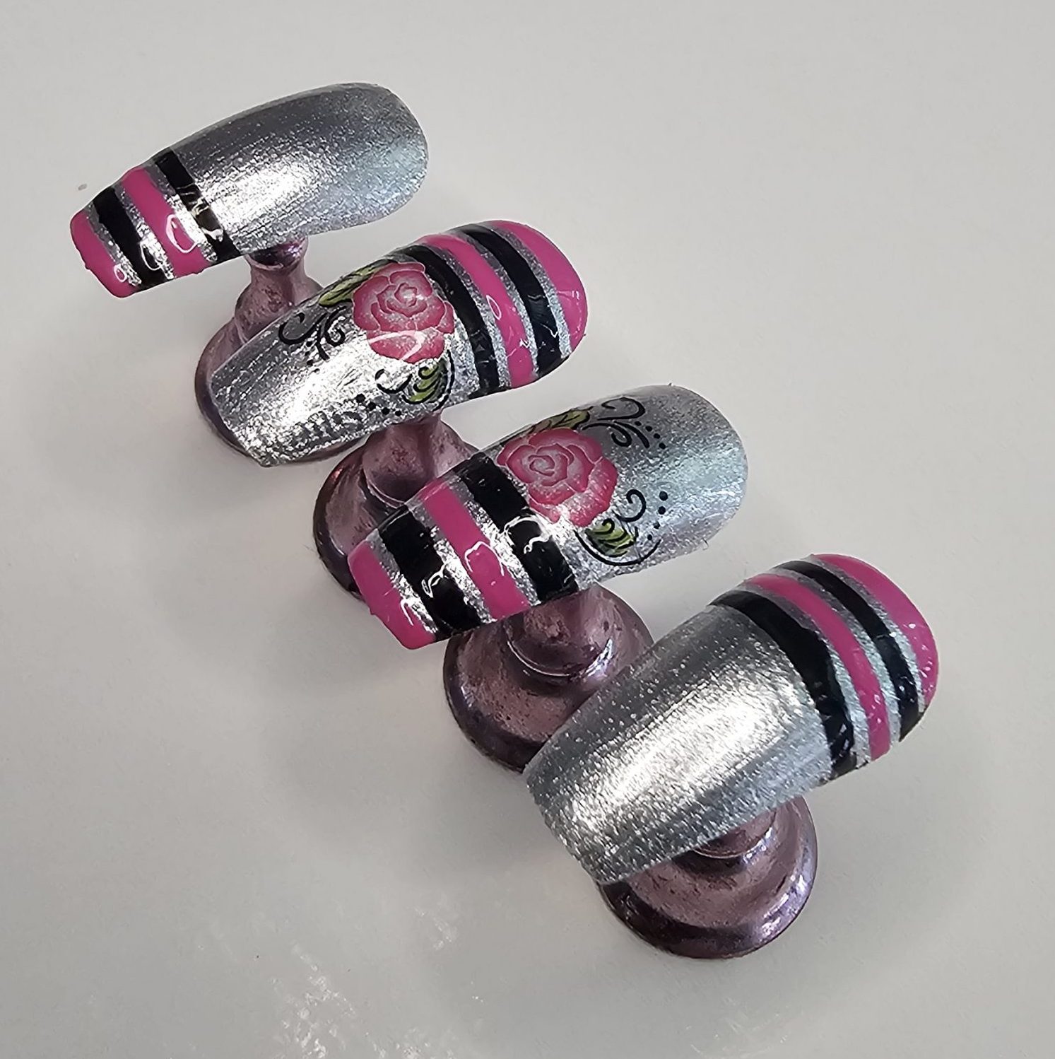 Step into a world of bold elegance with this stunning handcrafted press-on nail set. Featuring a sleek silver chrome base, this design is elevated with intricate hand-painted rose details that add a soft, feminine touch. The layered pink and black striping creates depth and contrast, giving the set a modern, high-fashion finish.
