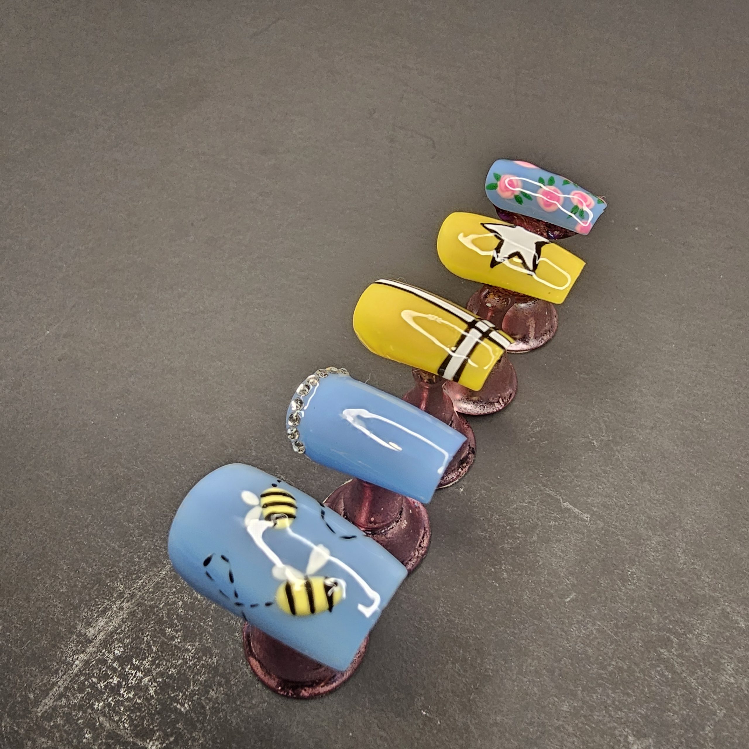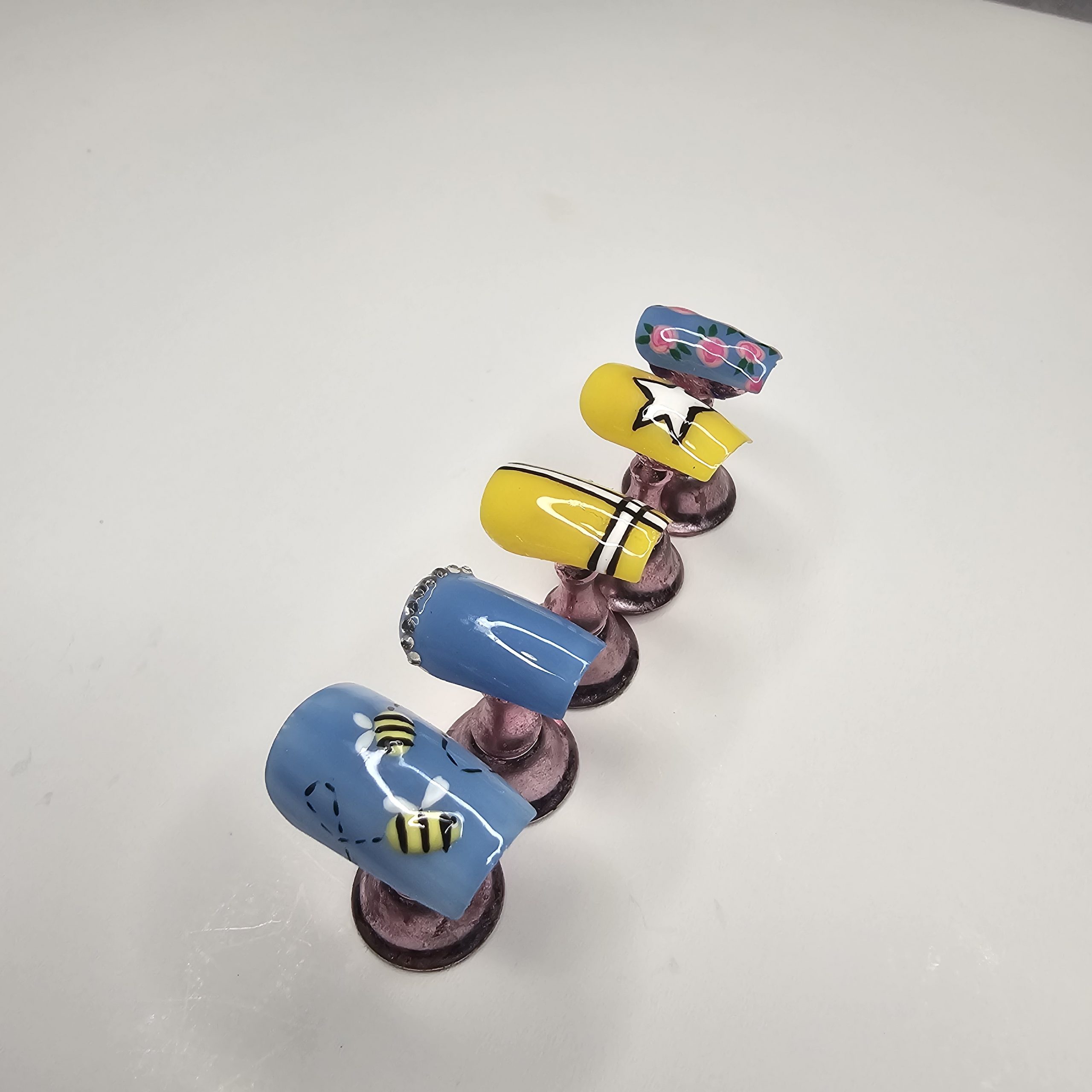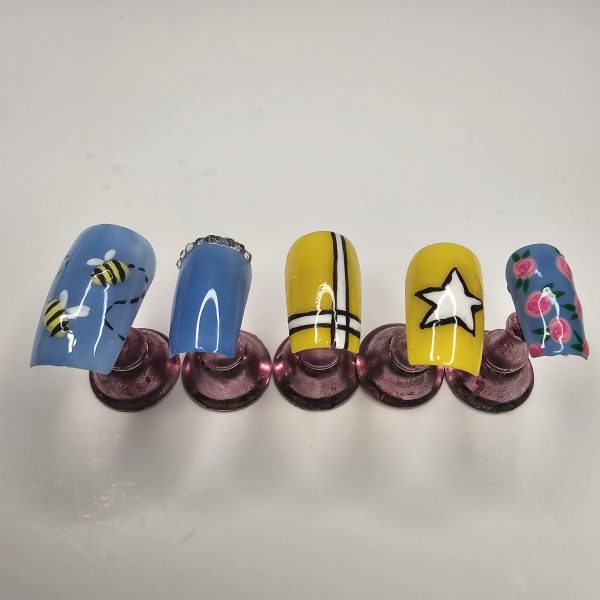 Turn heads with this vibrant, hand-painted press-on nail set featuring a fun mix of designs that blend whimsy with bold style. This set includes unique accent nails such as detailed bees, soft floral artwork, a chic star design, and modern line accents—all paired with a bright yellow and sky-blue color palette for the perfect pop.