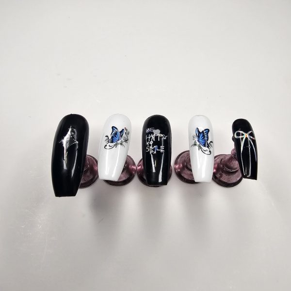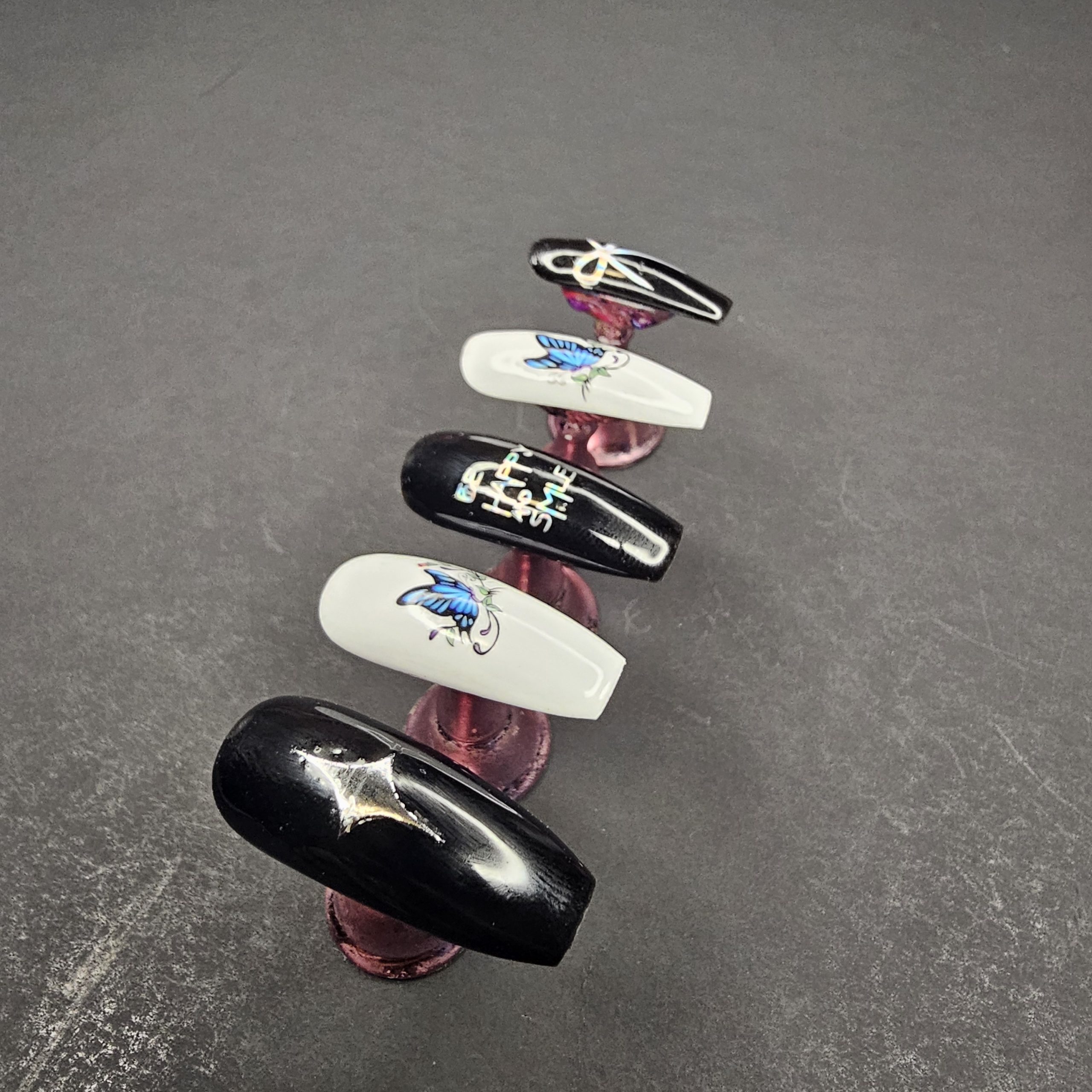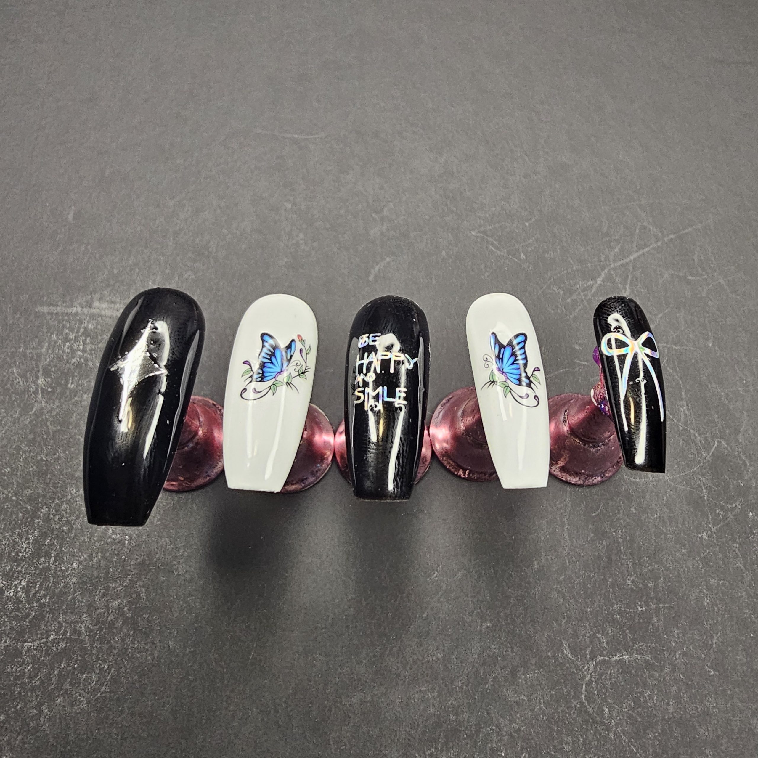 Elevate your nail game with this stunning handcrafted black and white press-on nail set, designed for the perfect balance of bold and delicate. This set features a sleek glossy finish paired with detailed butterfly accents and a statement nail with an uplifting message for a unique, expressive touch.