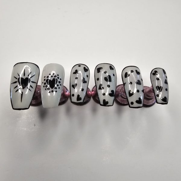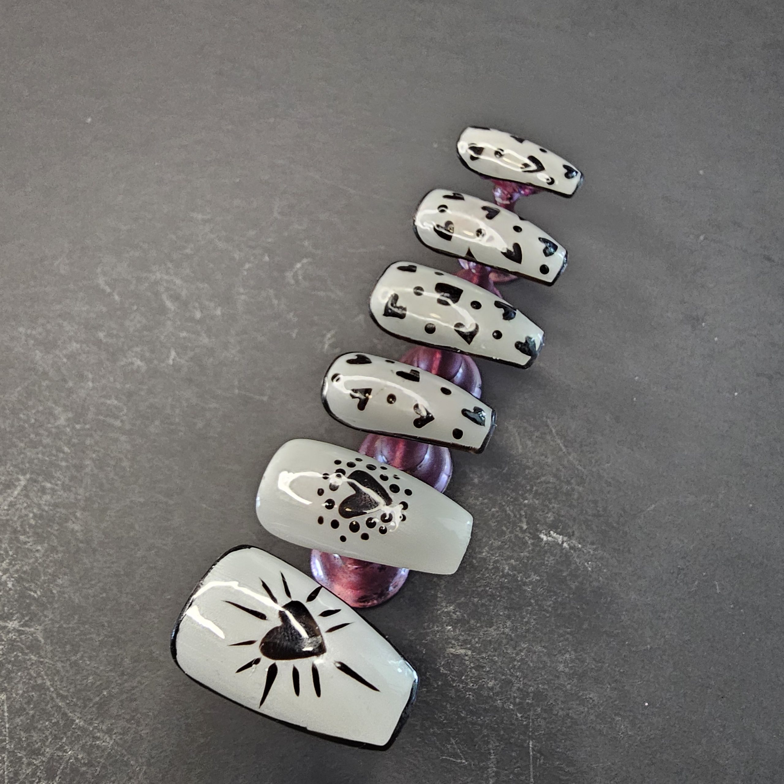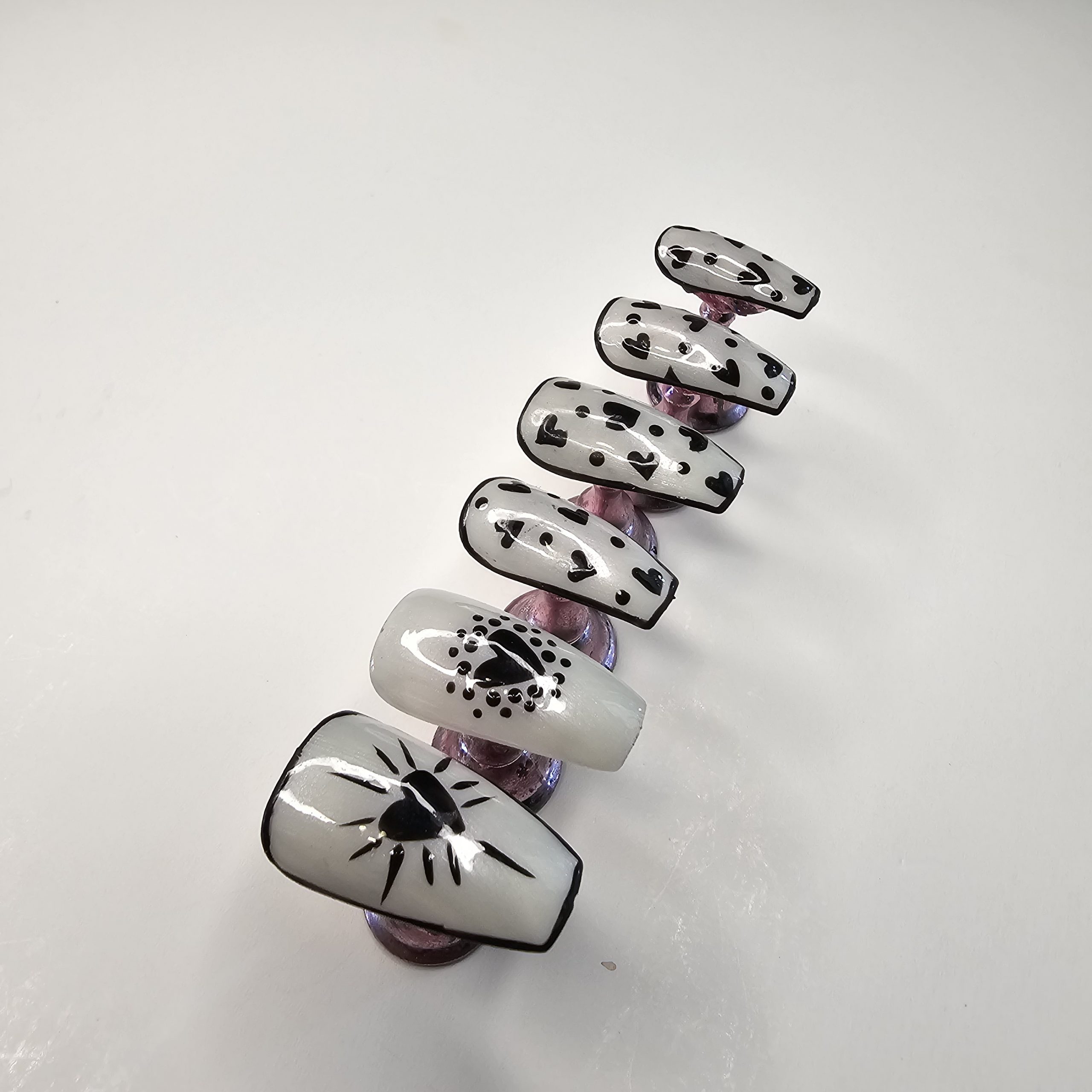 Fall in love with this chic black-and-white press-on nail set featuring a mix of bold heart accents, delicate dot detailing, and hand-drawn designs. This set blends minimal elegance with playful charm, making it perfect for both everyday wear and special occasions.