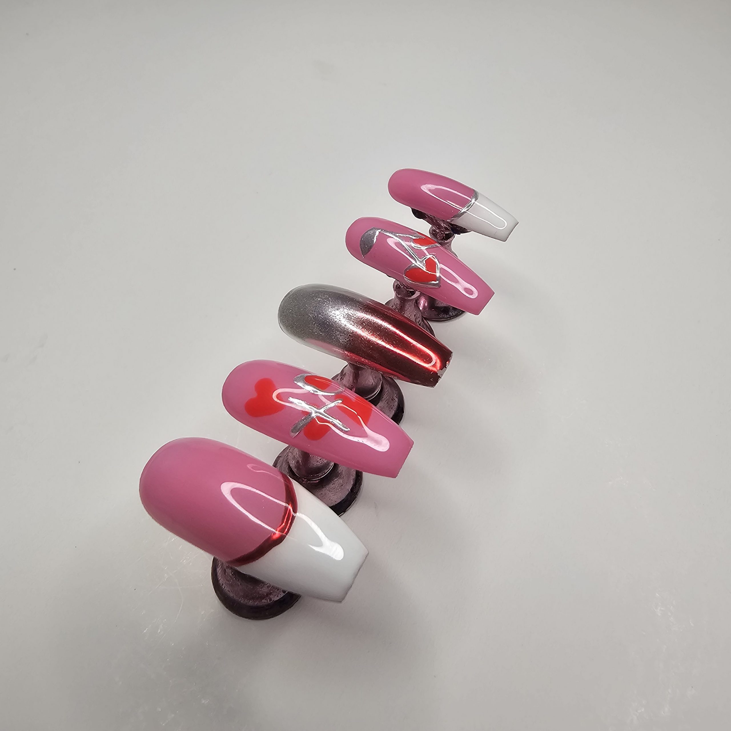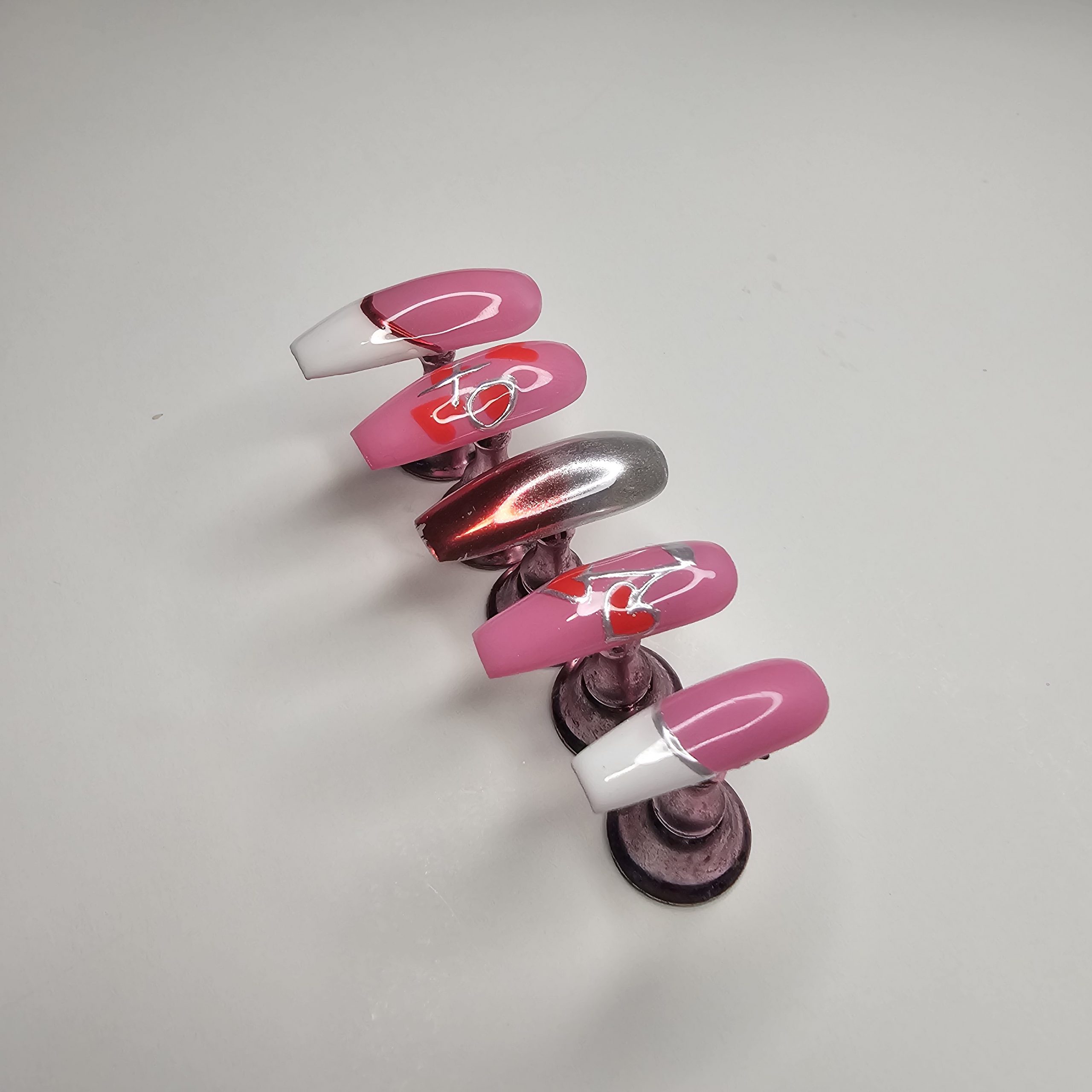 Fall in love with this handcrafted pink chrome heart nail set 💕 Featuring a glossy pink base, metallic chrome accents, and hand-painted heart details, this design is perfect for Valentine’s Day or anytime you want a romantic, bold look.