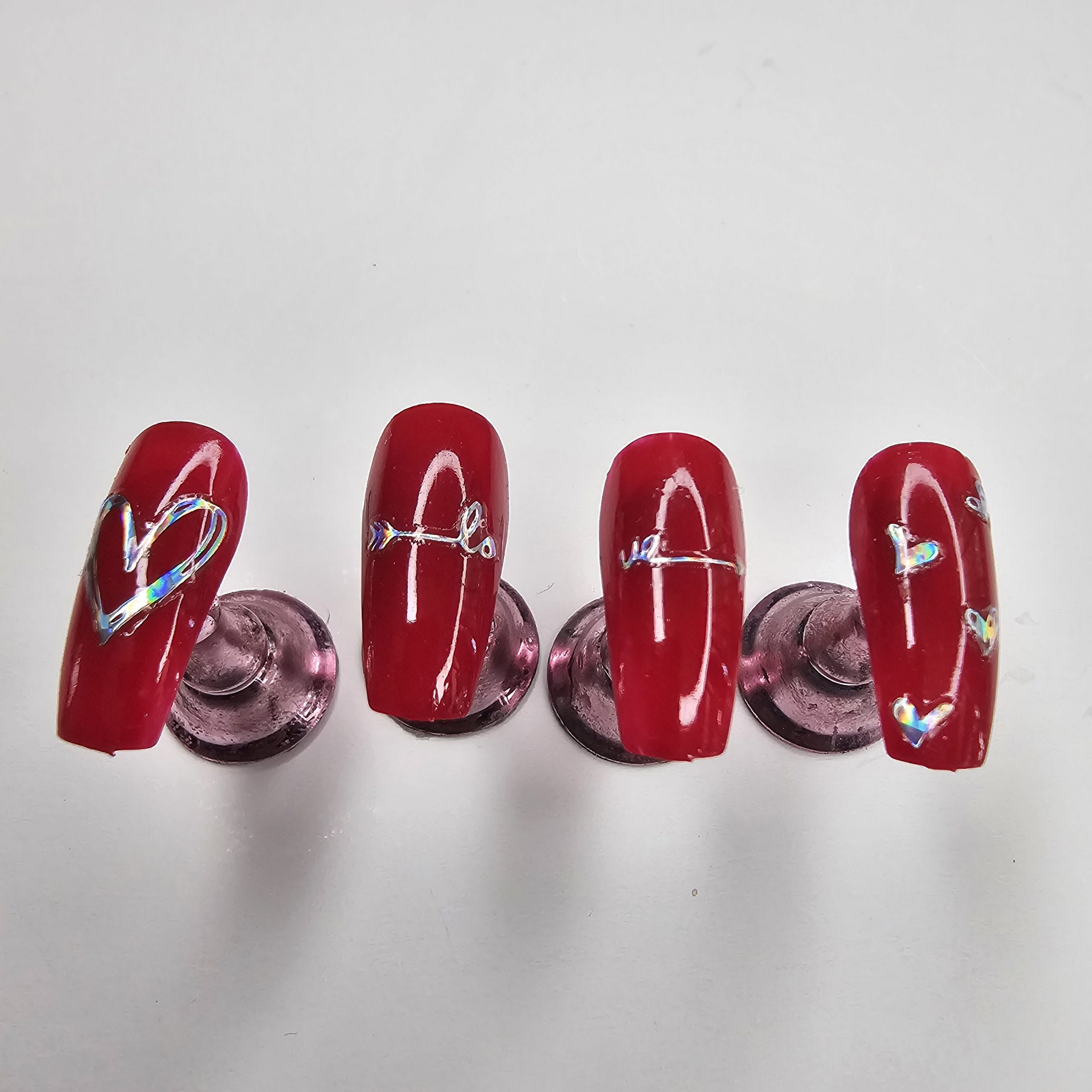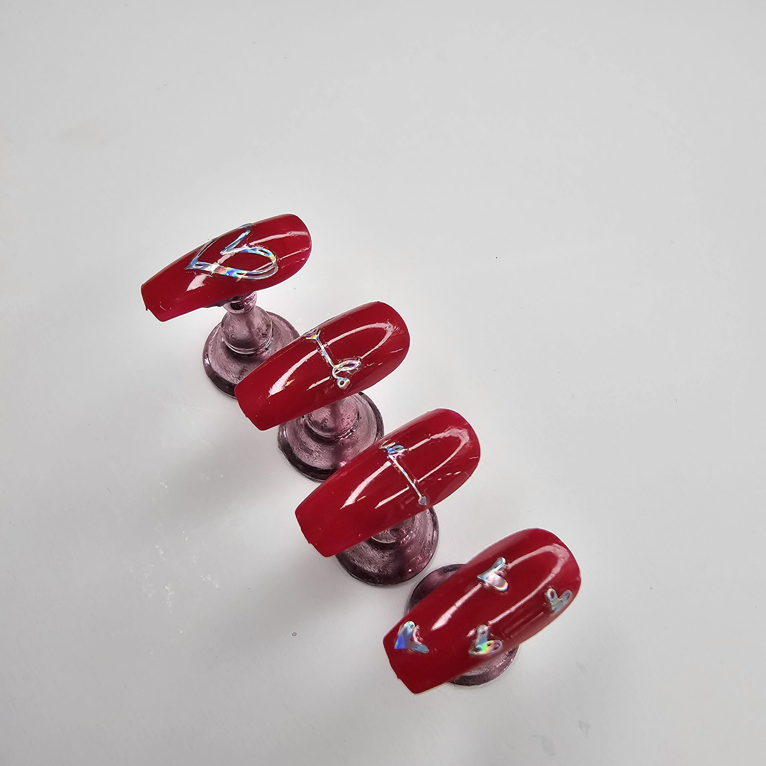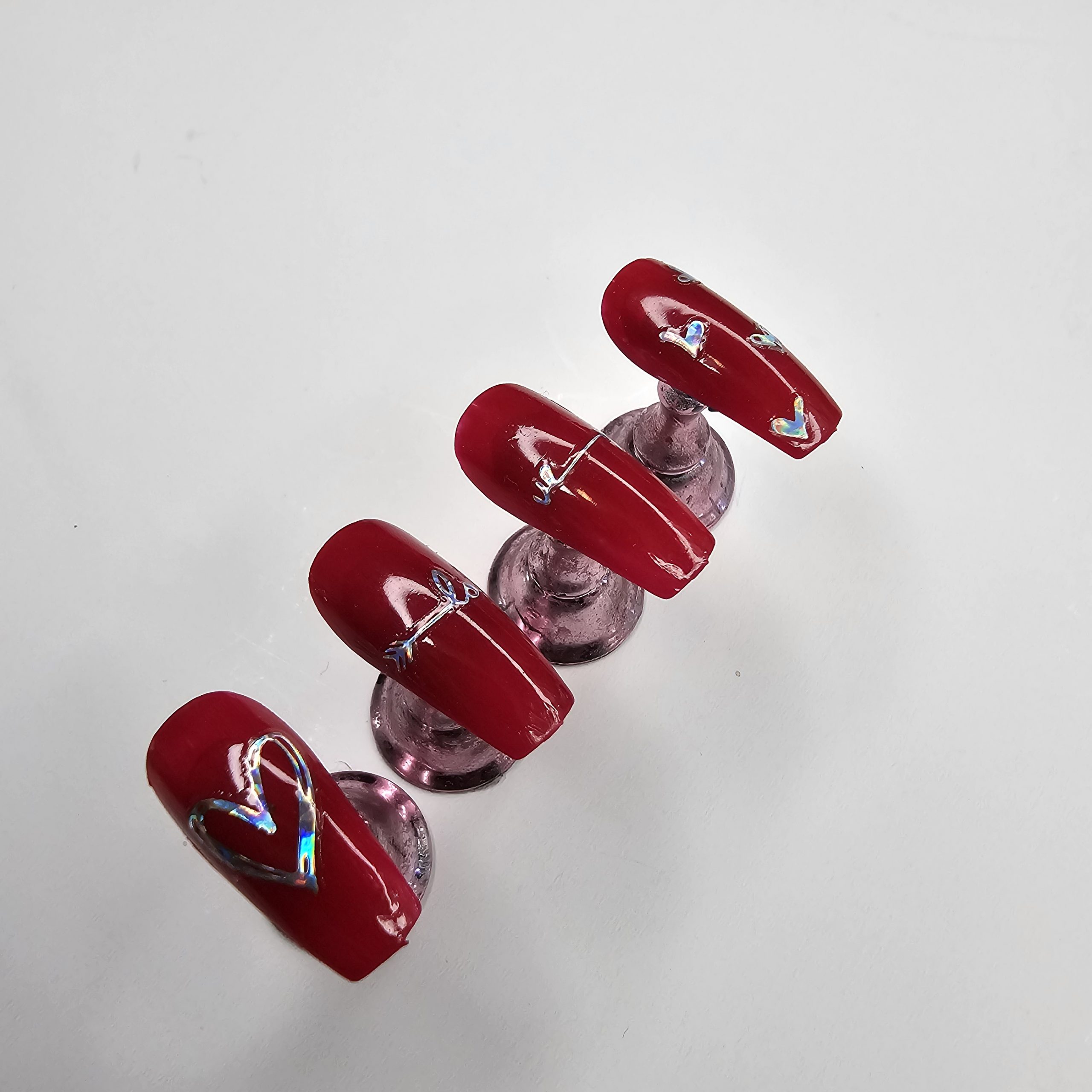 A stunning set of glossy red press-on nails designed with a smooth, vibrant finish and accented by iridescent chrome hearts and subtle metallic detailing. The combination of bold color and delicate design creates the perfect balance between romantic and edgy, making this set ideal for anyone who loves to stand out while keeping it classy. Durable, reusable, and easy to applyโyour go-to set for instant glam.