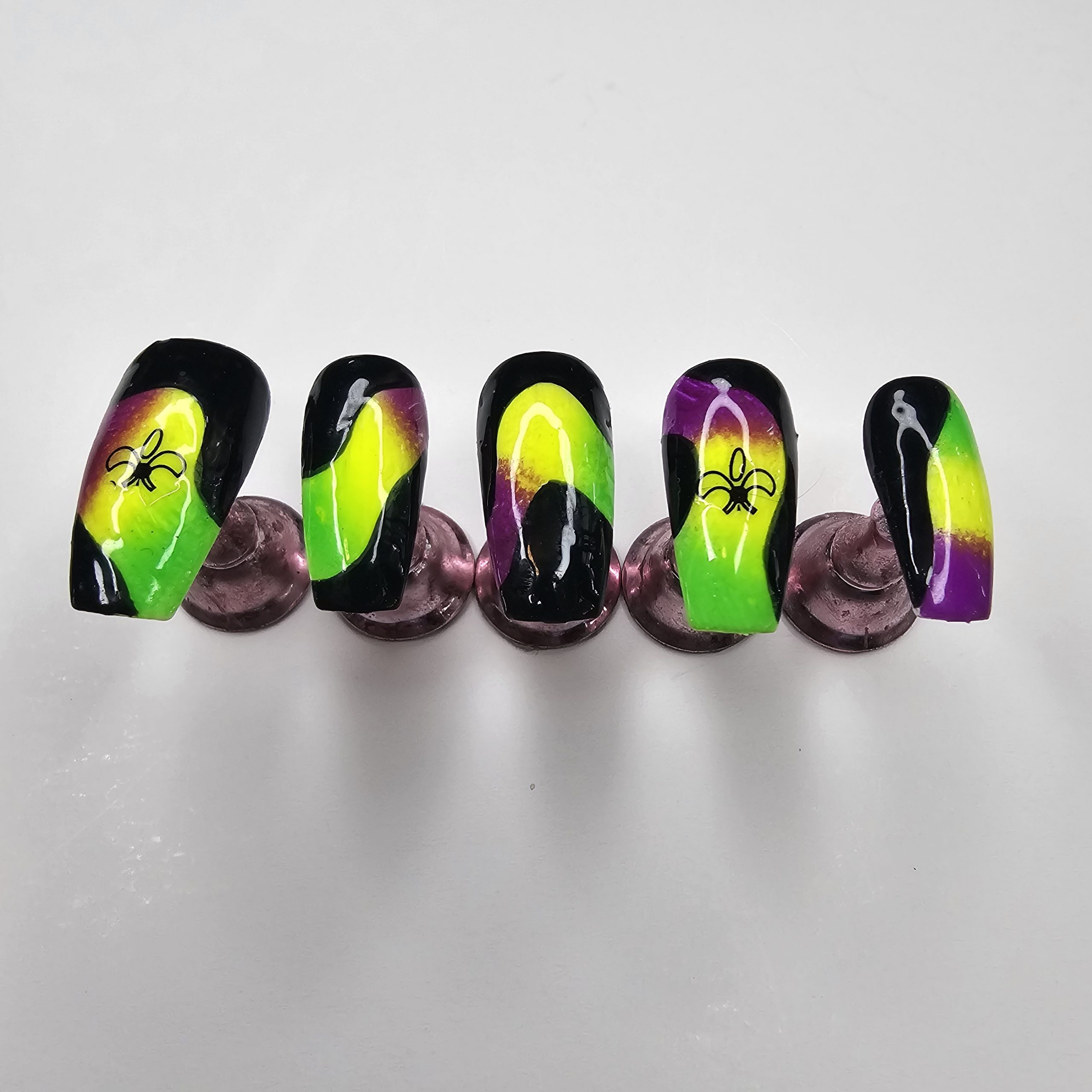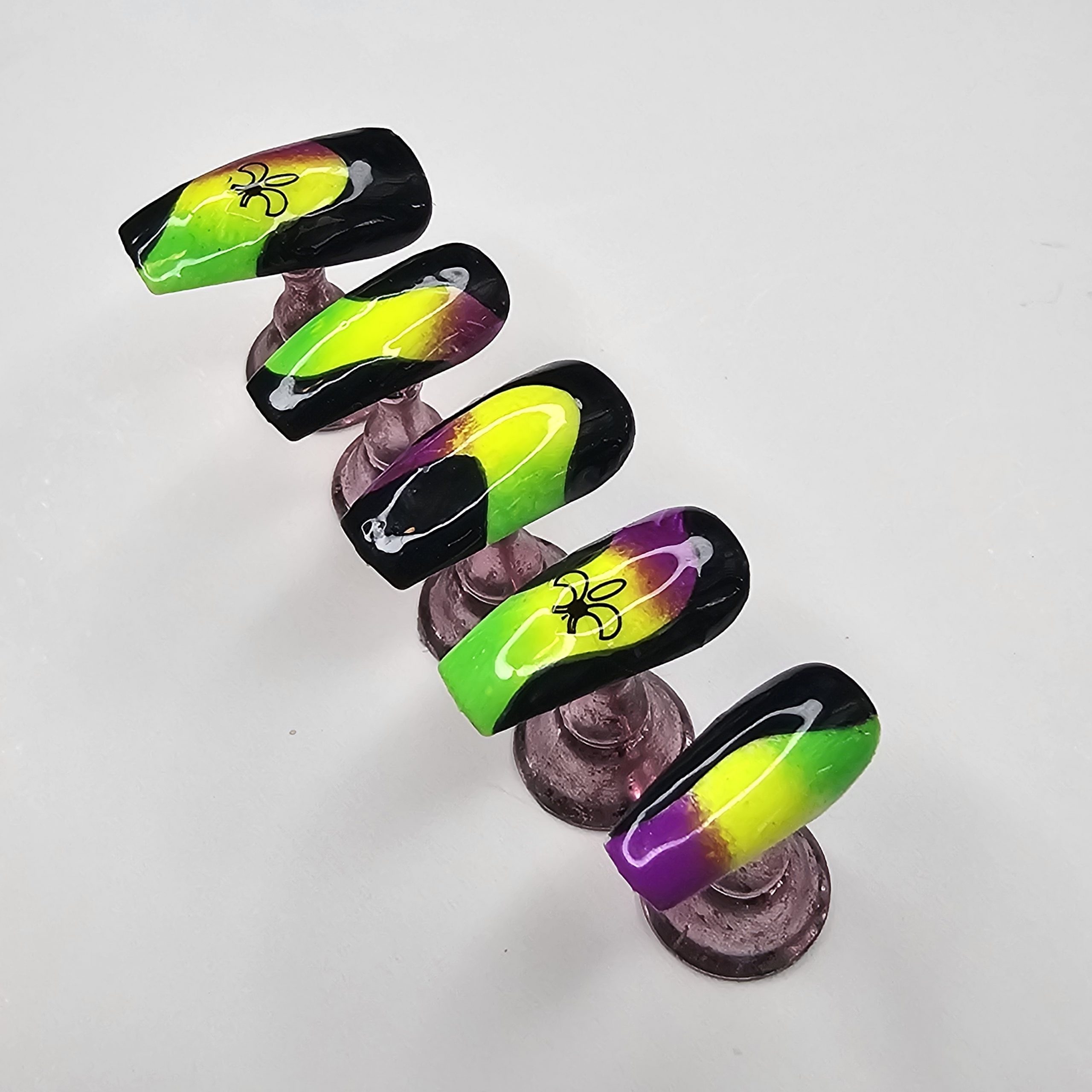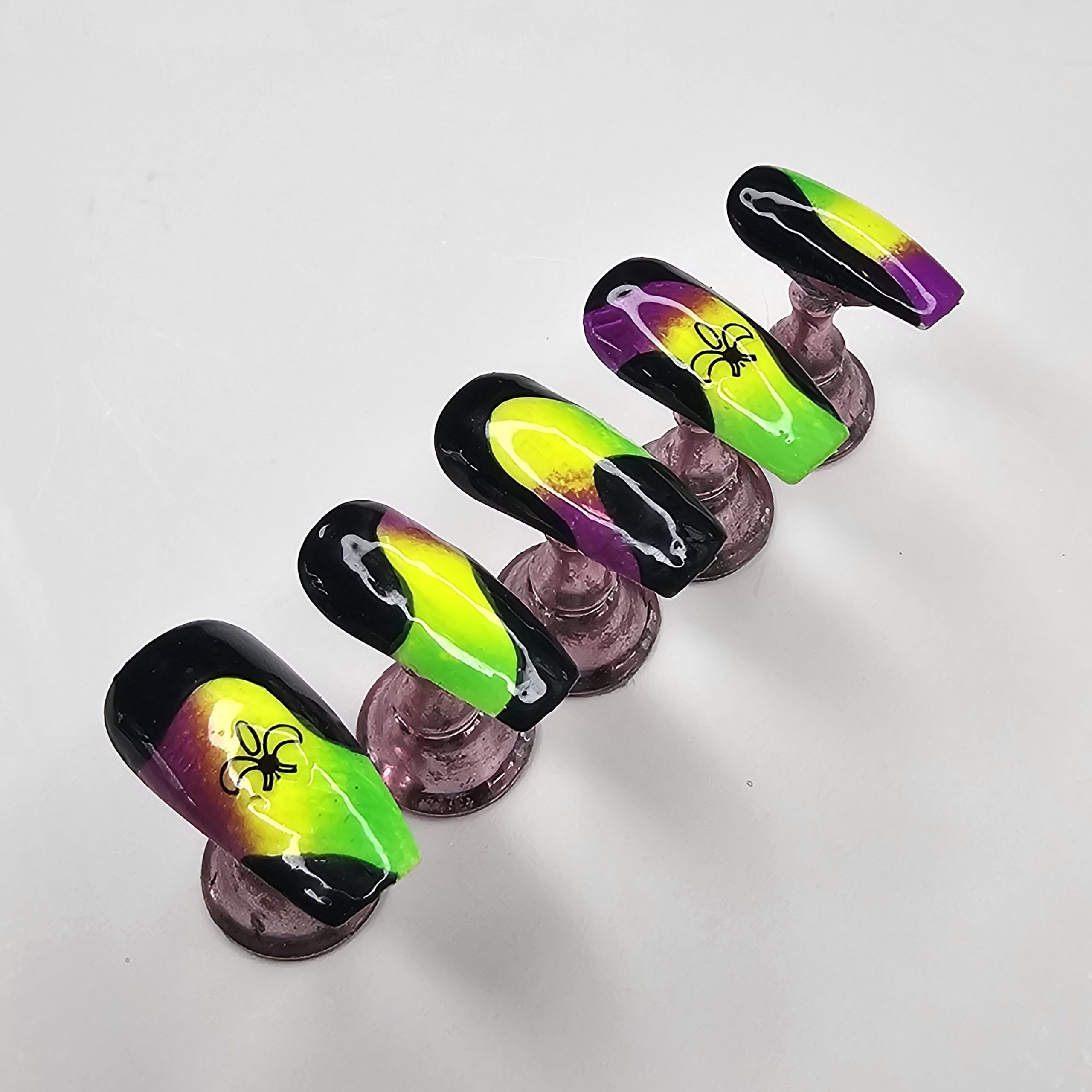Turn heads with this bold, hand-painted press-on nail set featuring a striking neon blend of green, yellow, and purple over a glossy black base. The abstract flow design creates a glowing effect, while subtle spider accents add a unique, edgy vibe.