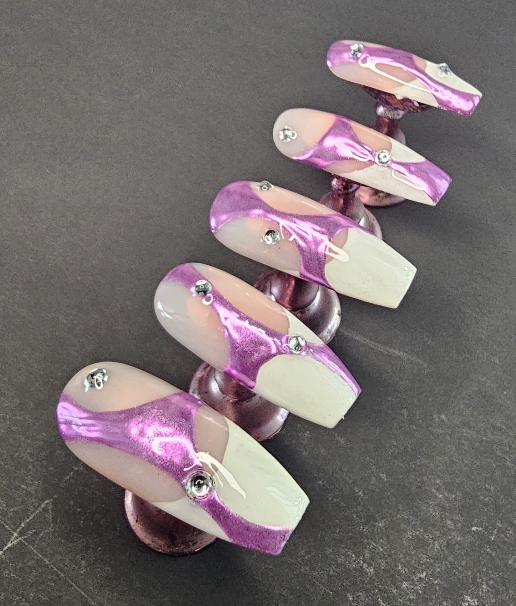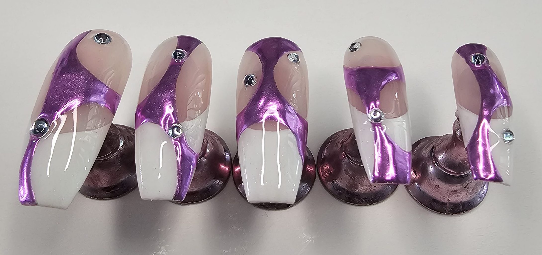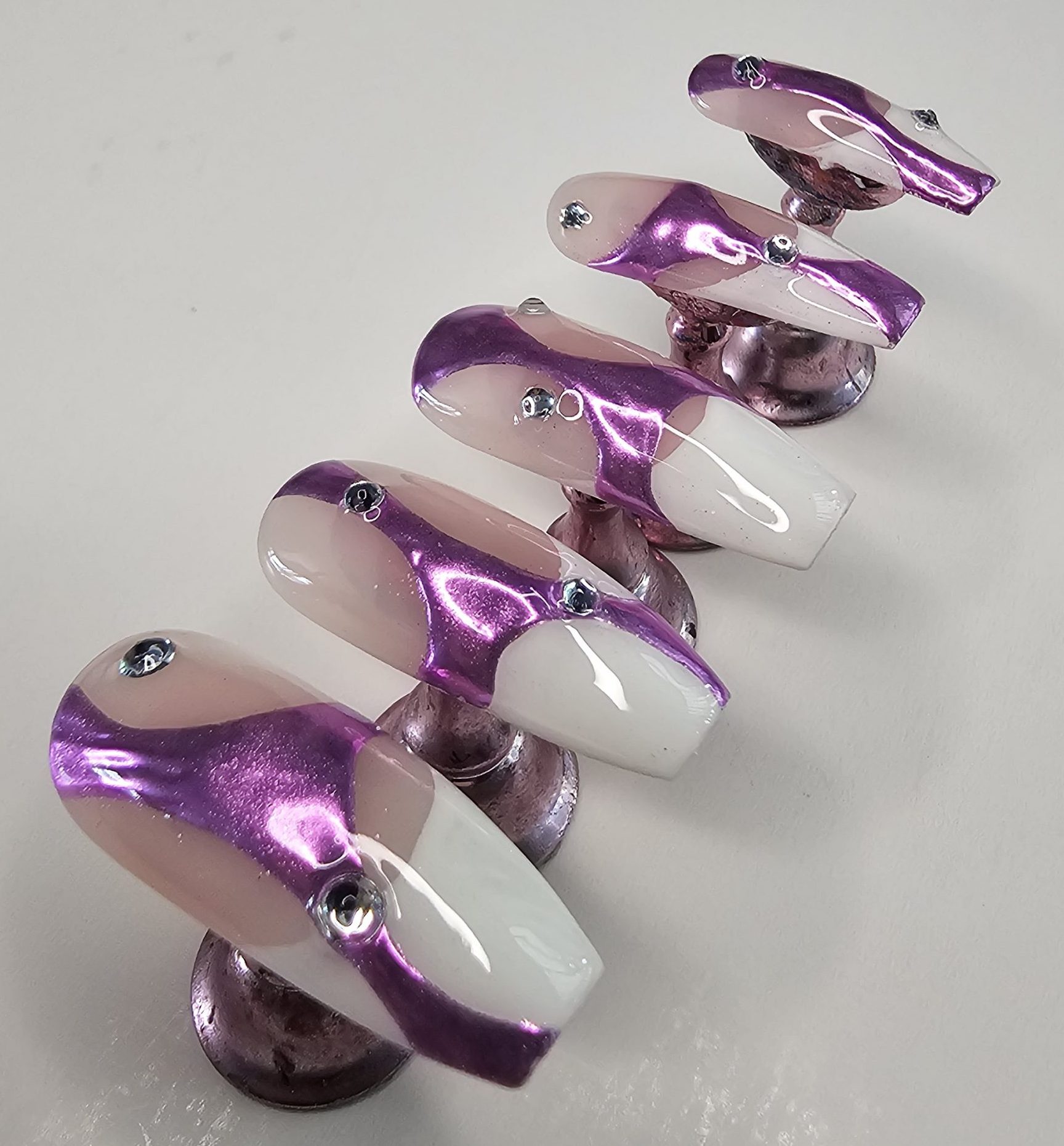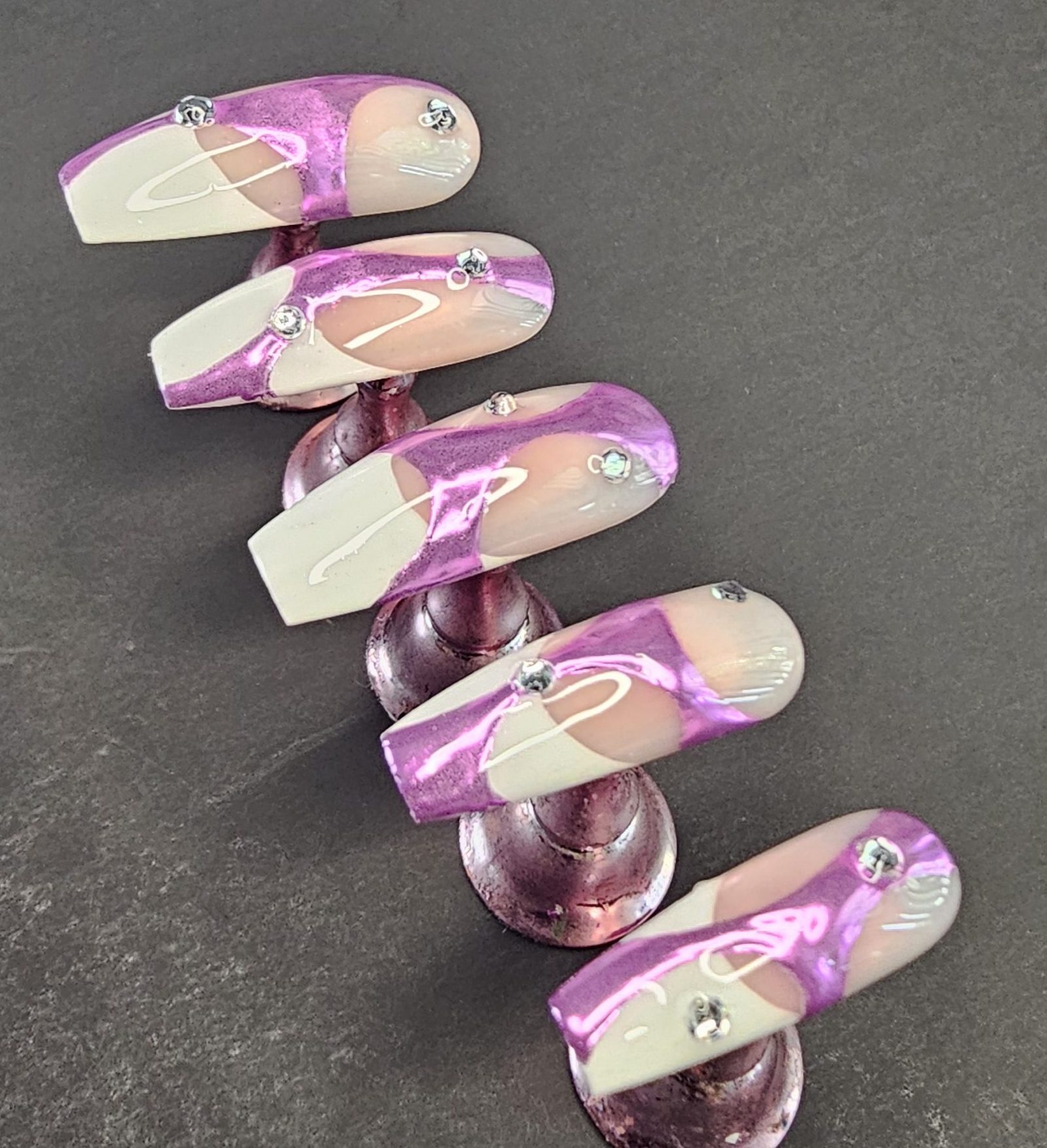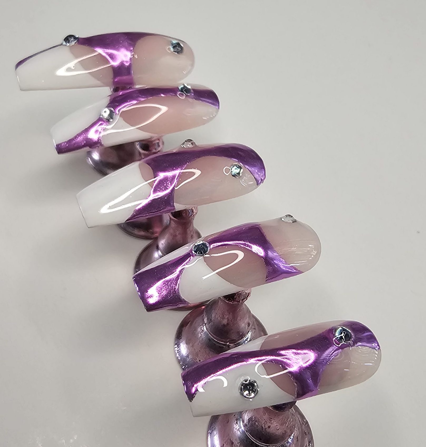 Step into luxury with this stunning handmade press-on nail set featuring a sleek nude base, elevated by bold purple chrome swirl designs and sparkling rhinestone accents. And those French tipis tho! This set is designed for anyone who loves a mix of elegance and statement style—perfect for special occasions, photoshoots, or everyday glam.