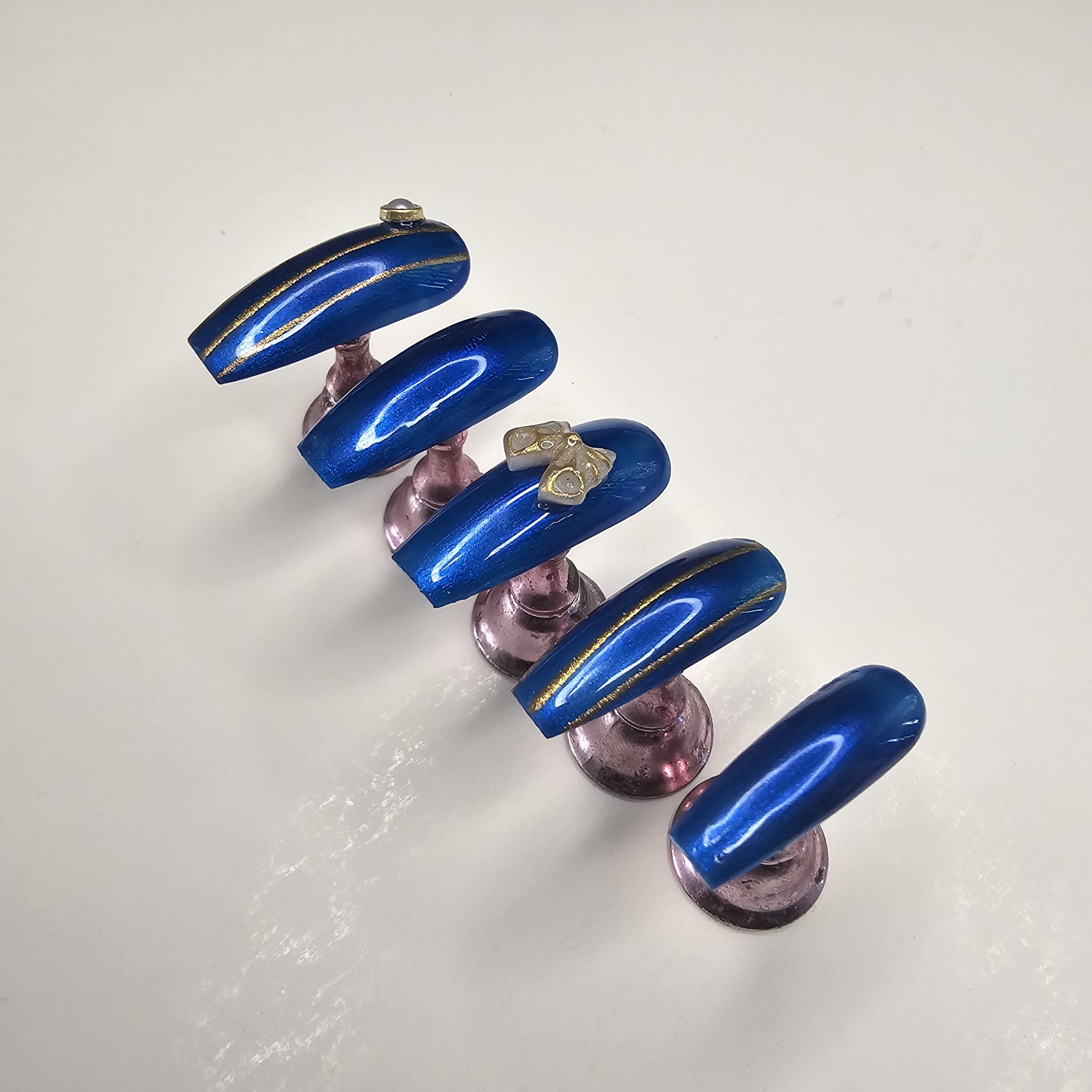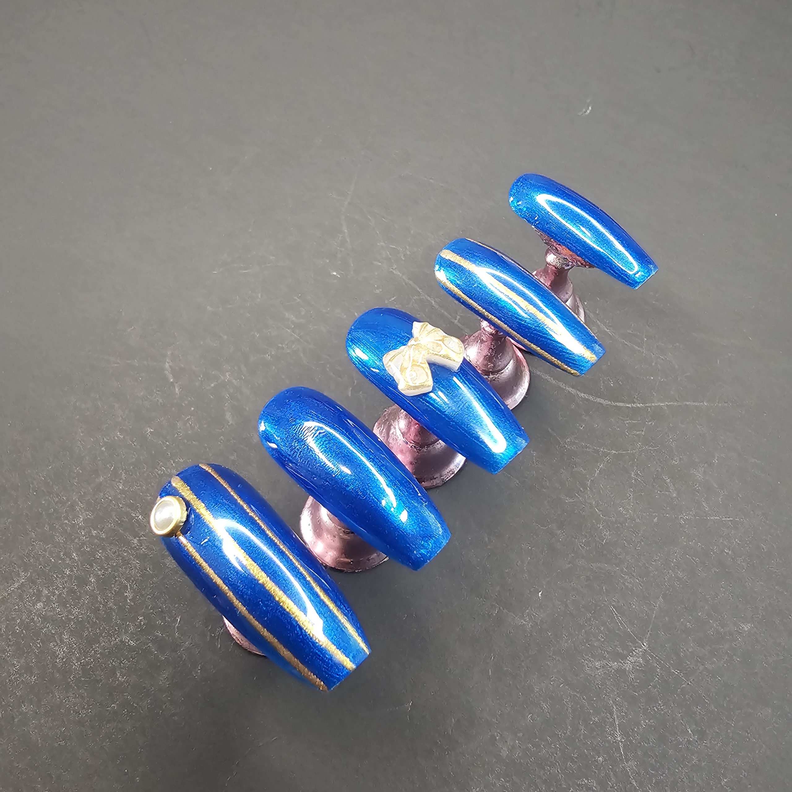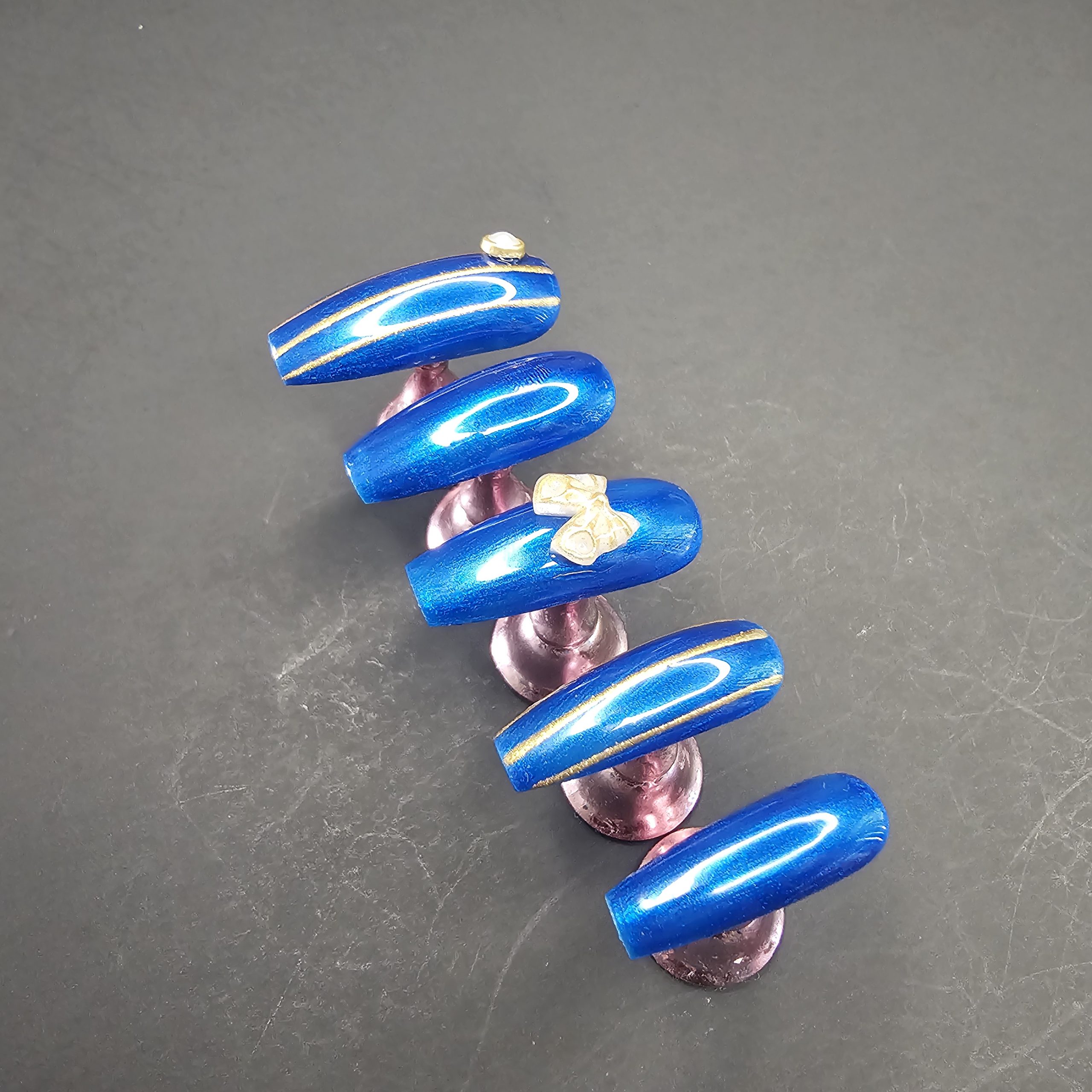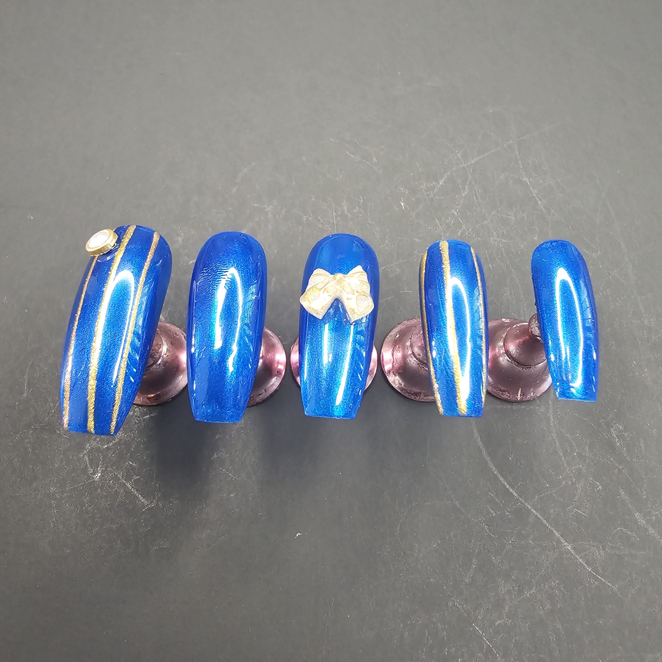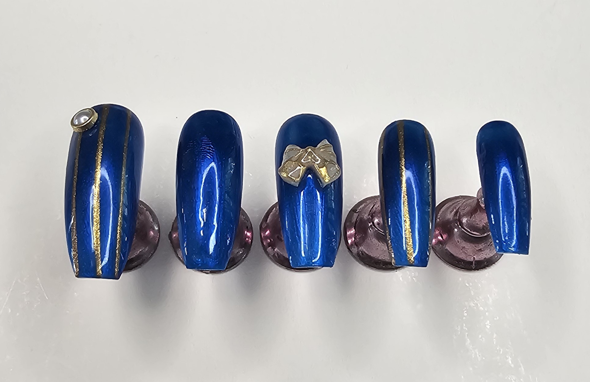 Turn heads with this stunning royal blue press-on nail set, designed for bold, confident beauty lovers. Featuring a high-gloss finish, each nail is accented with sleek metallic gold striping for a luxe, polished look. The set is elevated with a statement bow charm and rhinestone detail, adding the perfect touch of elegance and glam.