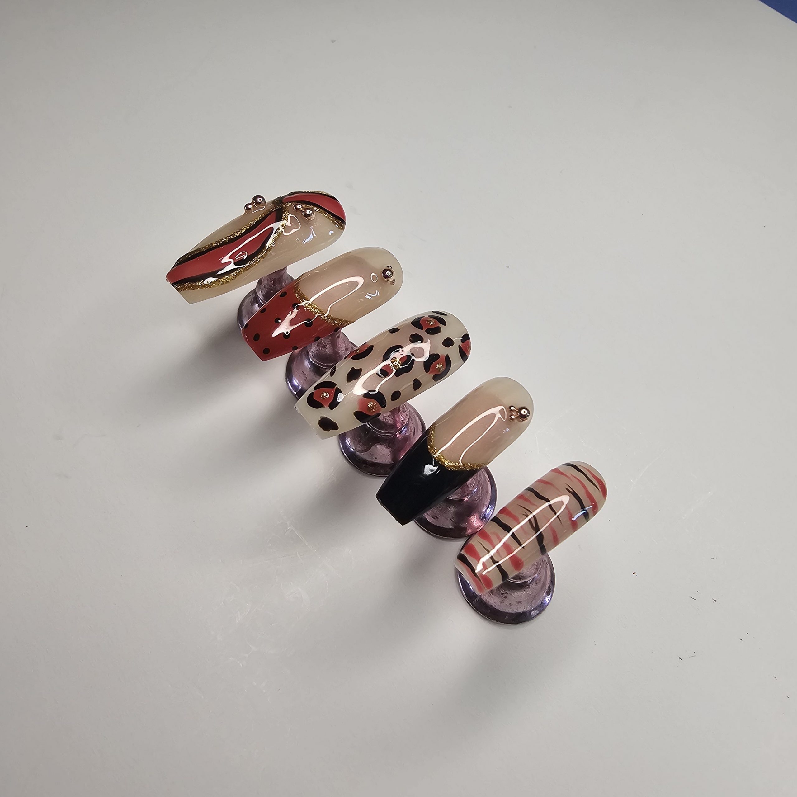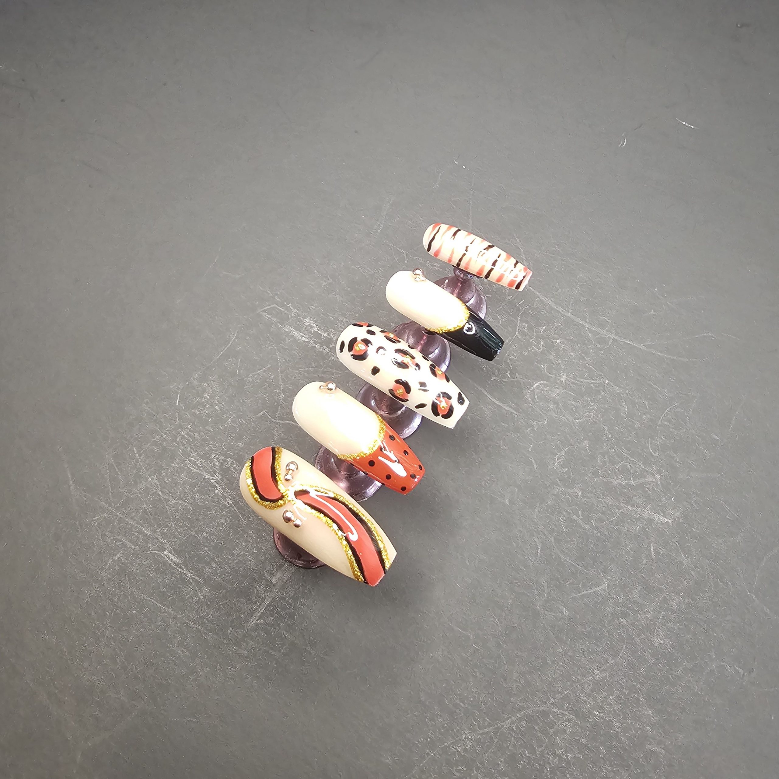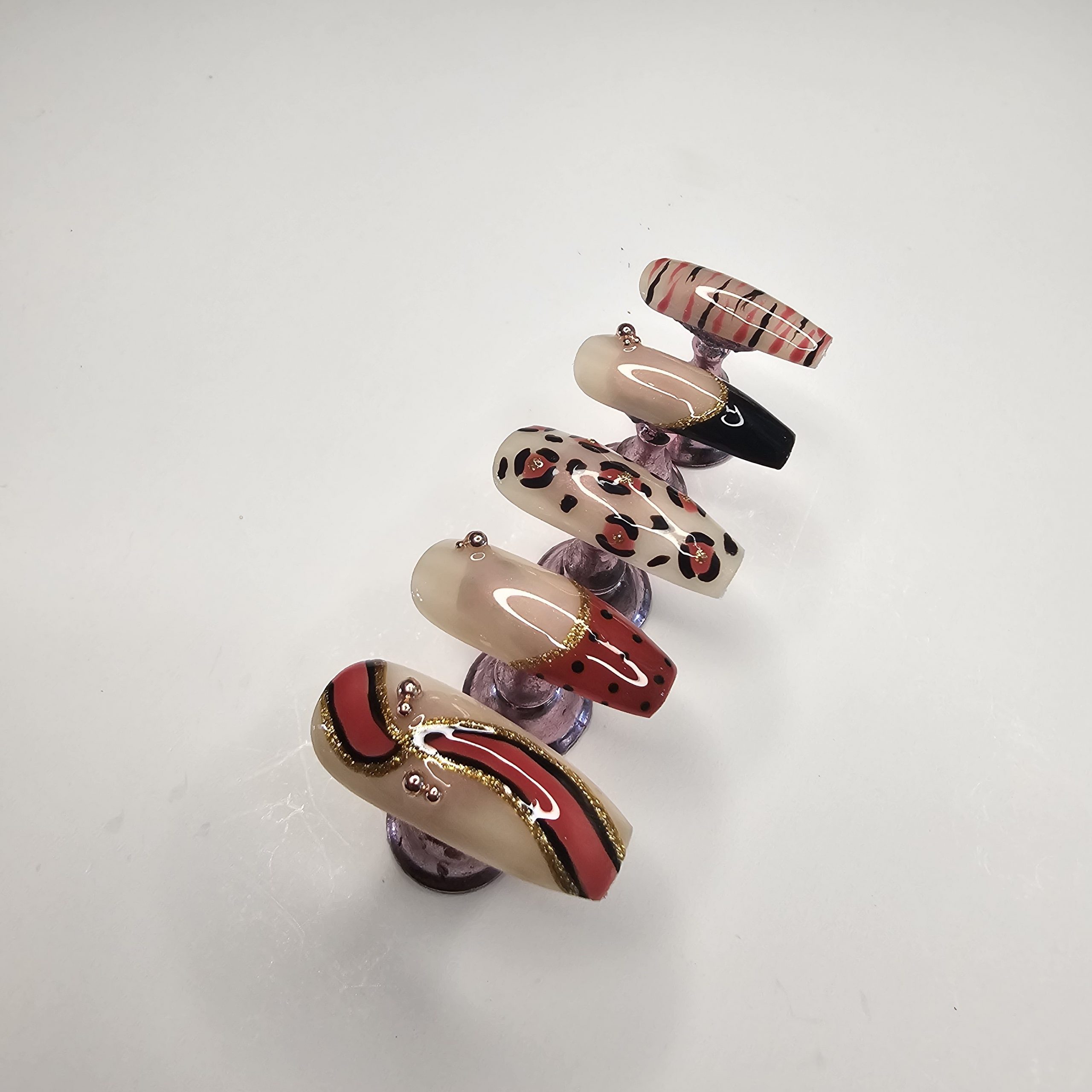 Press-on nail set featuring a curated mix of modern and animal-inspired designs. This set includes abstract swirl art, classic leopard print, minimalist stripes, and glossy color-blocked accents in a rich palette of nude, red, black, and gold. Each nail is finished with a high-shine top coat and delicate embellishments for a polished, salon-quality look.