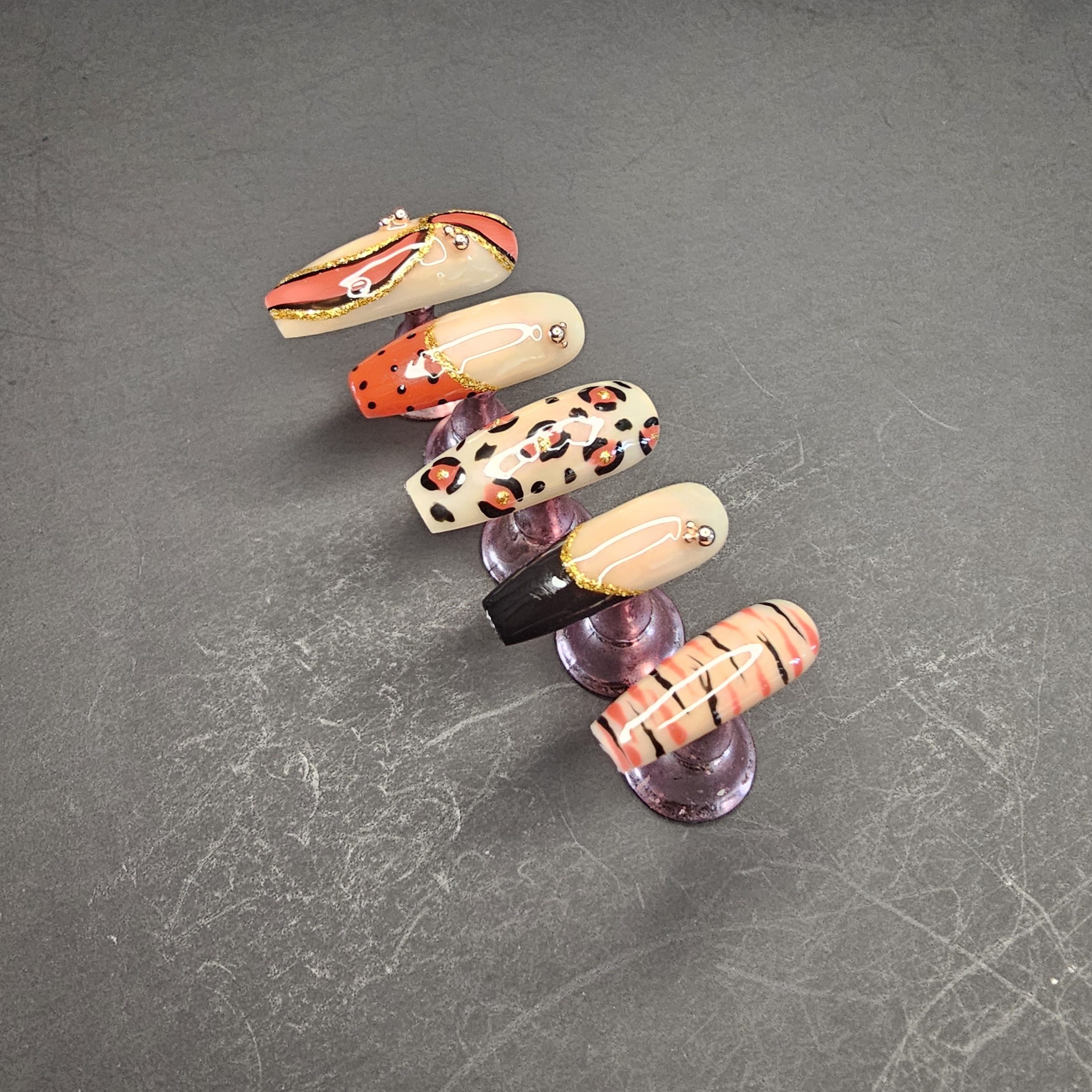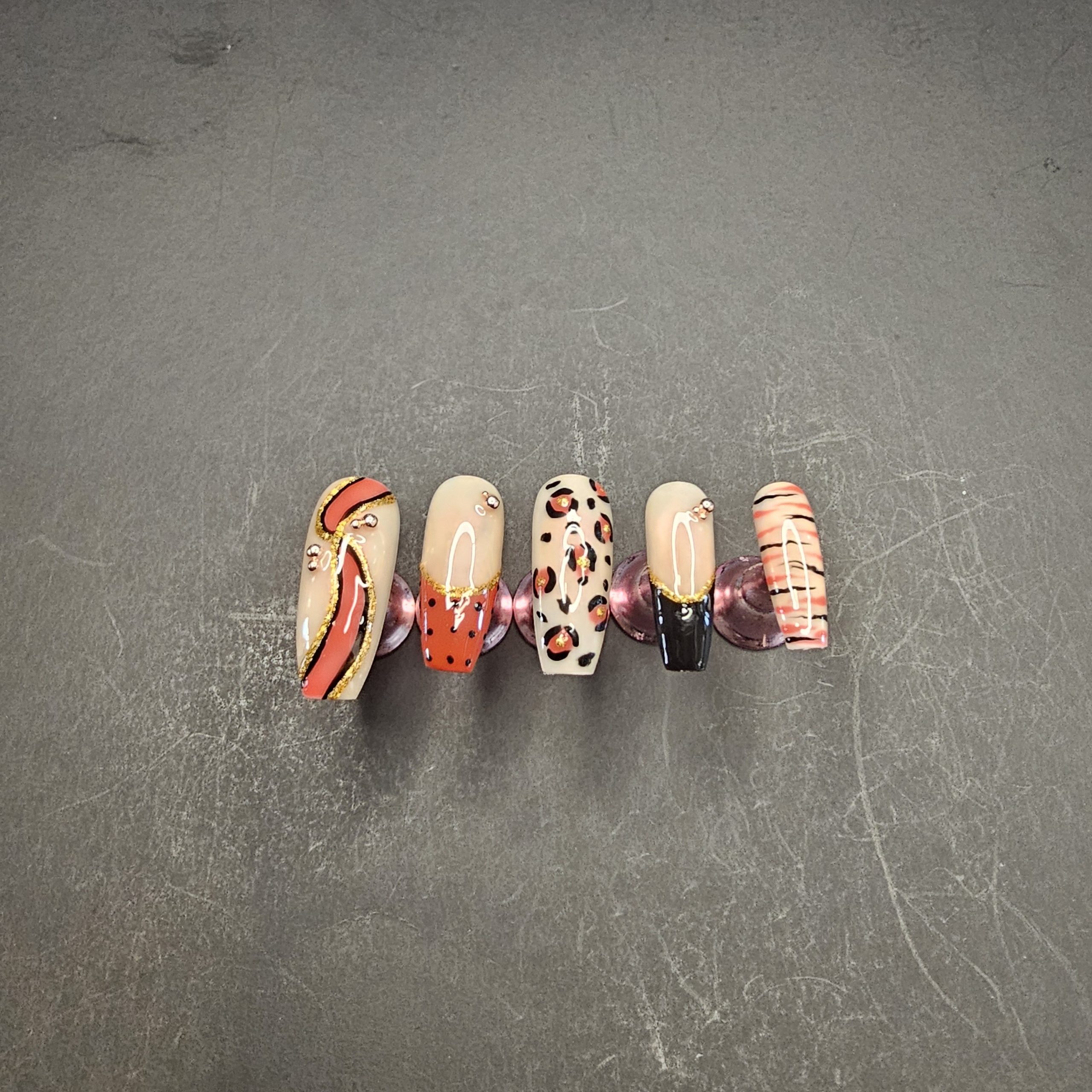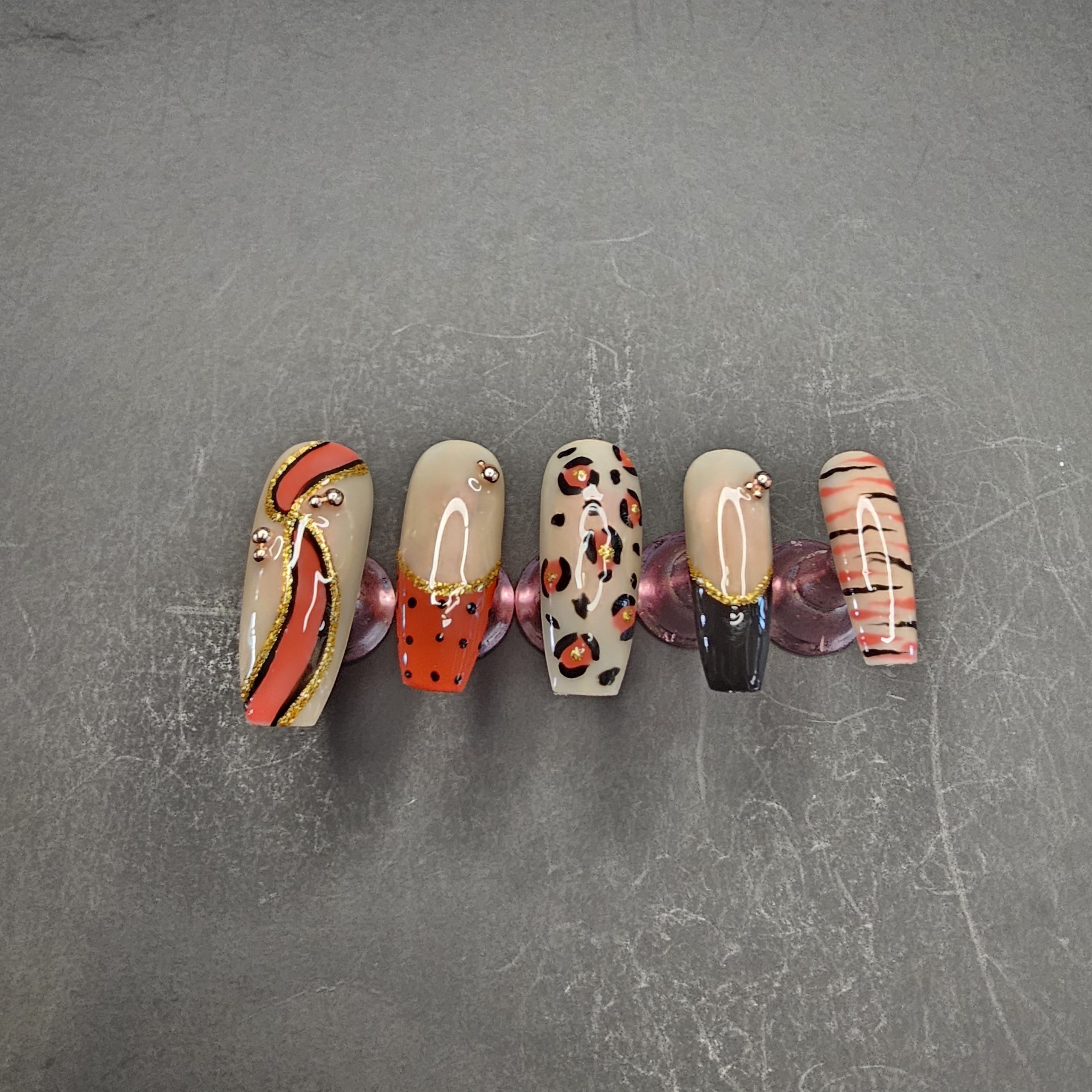 Press-on nail set featuring a curated mix of modern and animal-inspired designs. This set includes abstract swirl art, classic leopard print, minimalist stripes, and glossy color-blocked accents in a rich palette of nude, red, black, and gold. Each nail is finished with a high-shine top coat and delicate embellishments for a polished, salon-quality look.