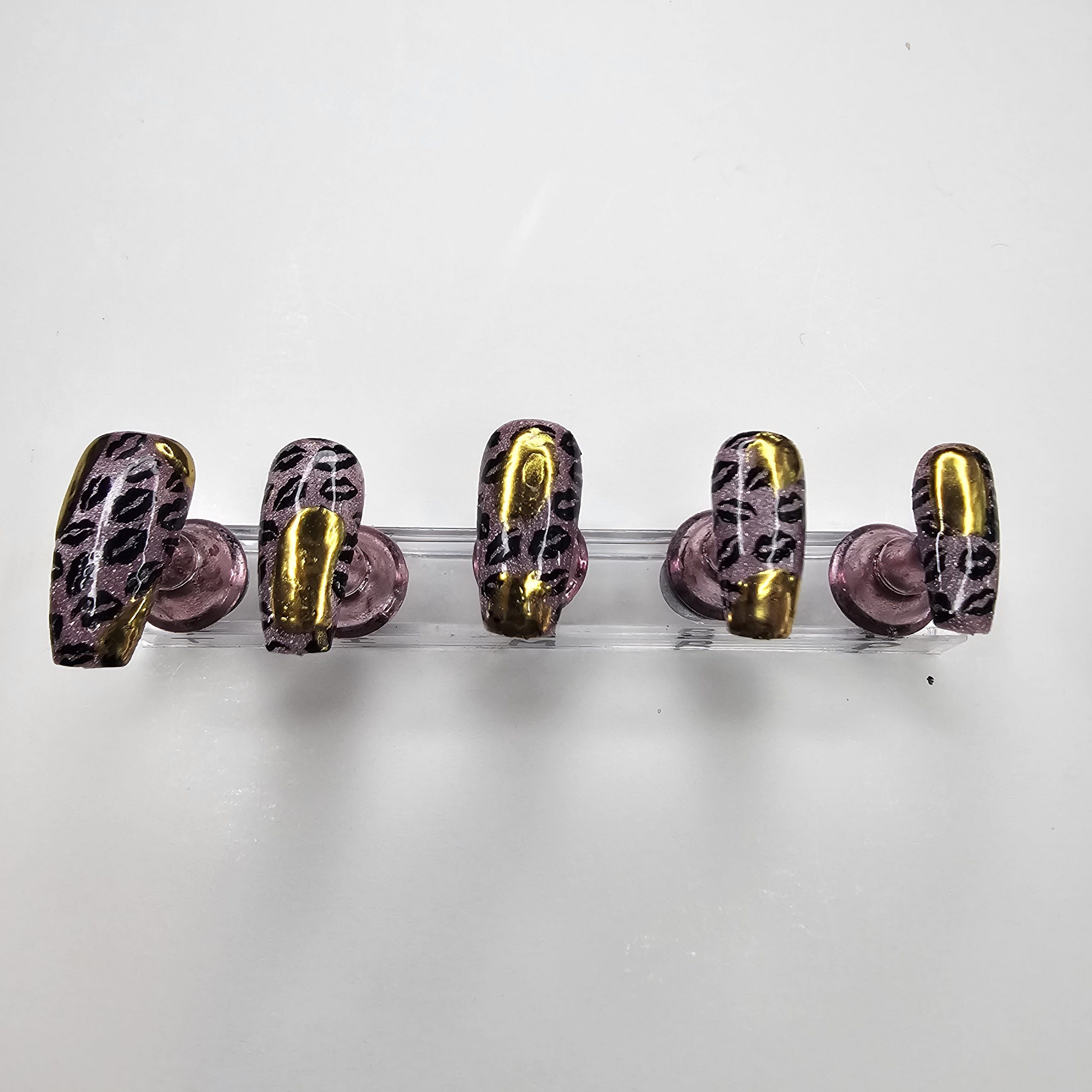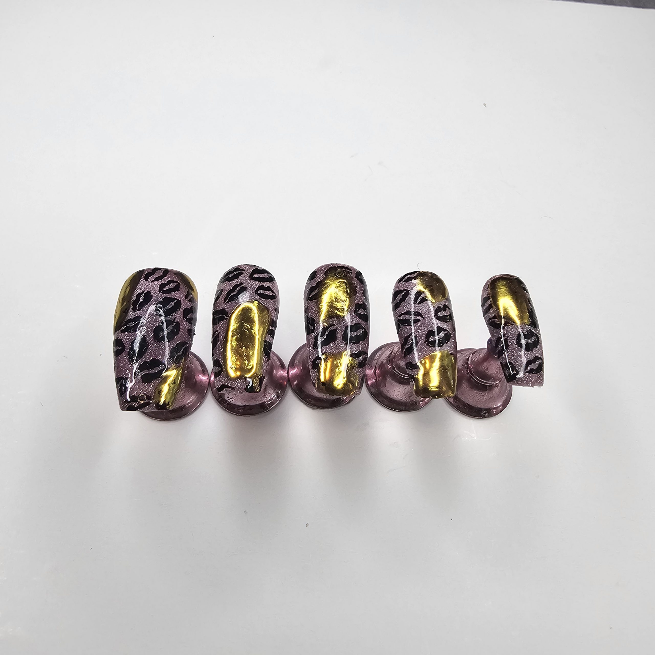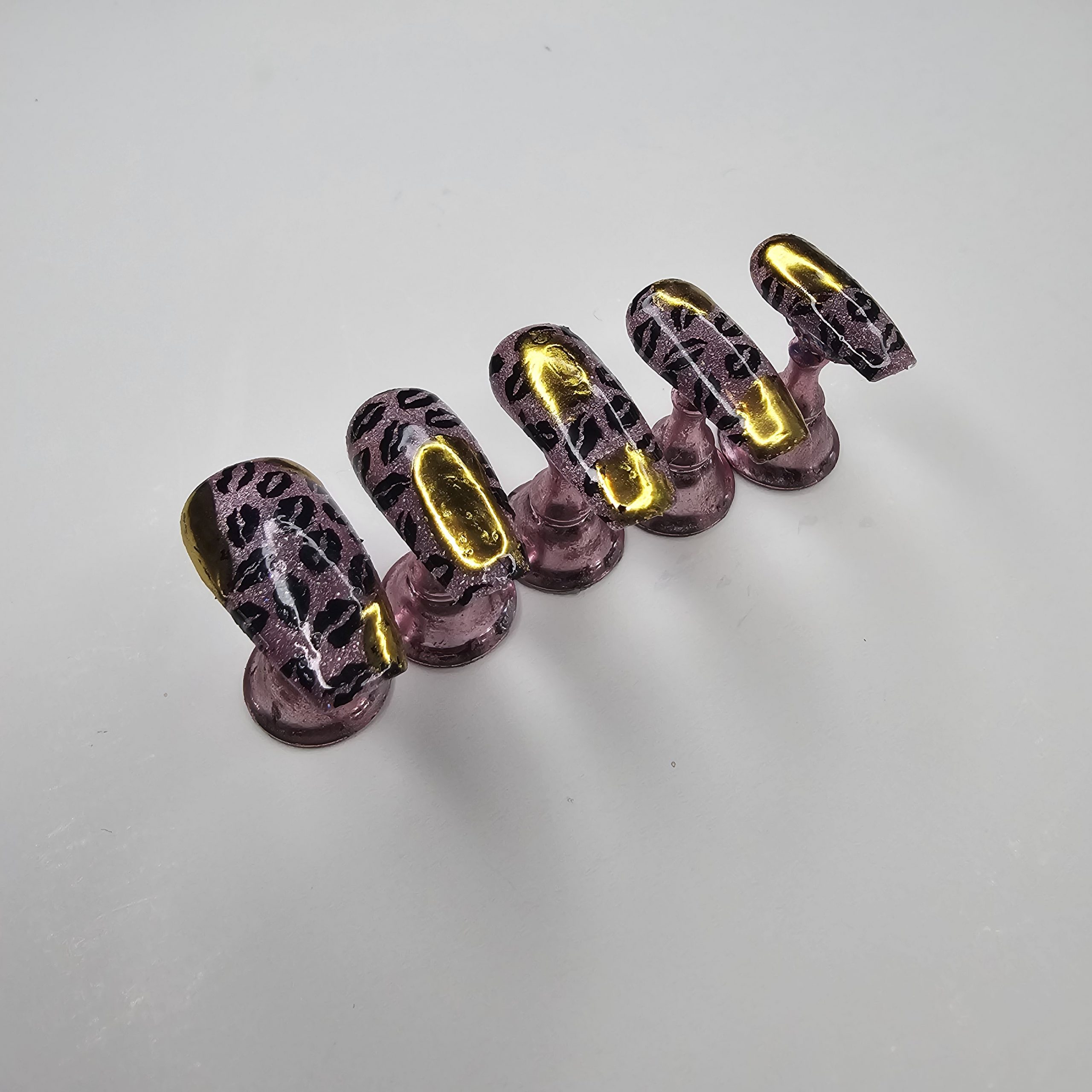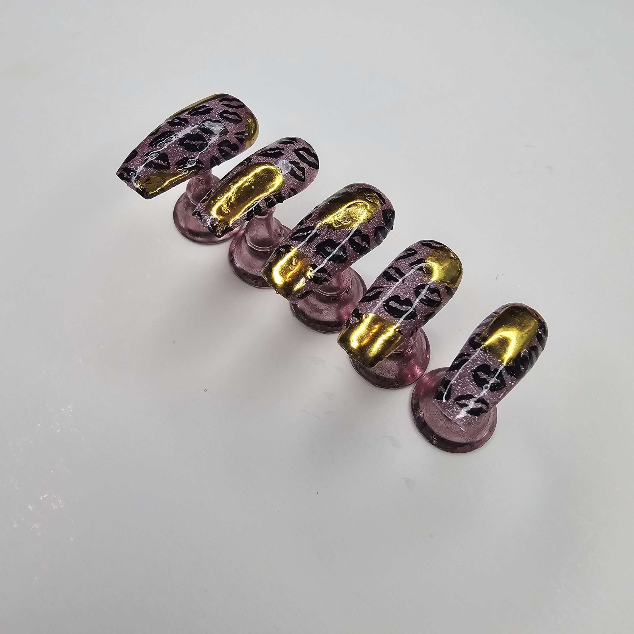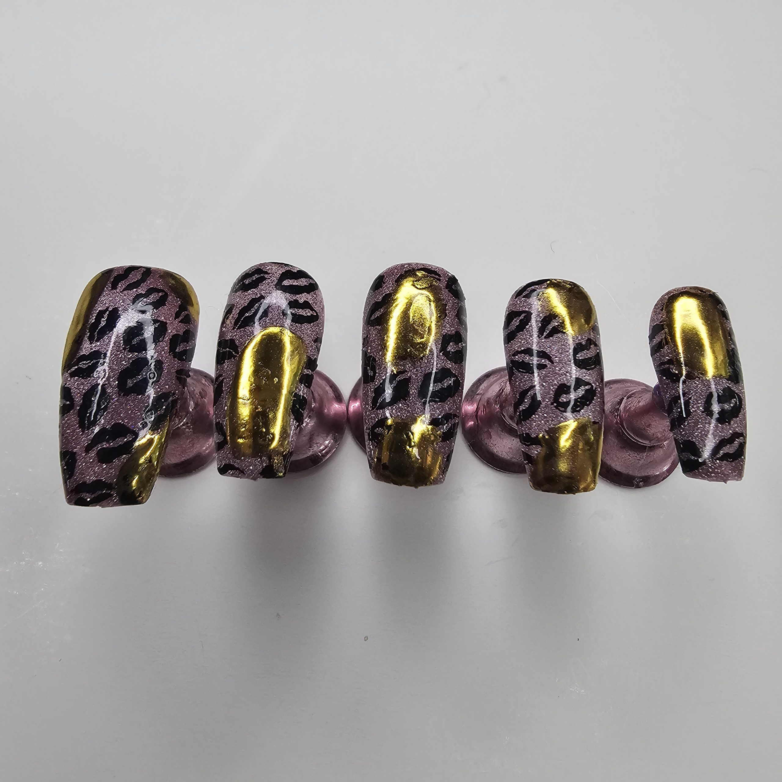 Turn every gesture into a statement with this bold, feminine press-on nail set. Each nail features a stunning mauve-pink metallic base layered with a subtle shimmer that catches the light beautifully. Overlaid is a sleek black leopard print pattern, adding just the right amount of edge and attitude.